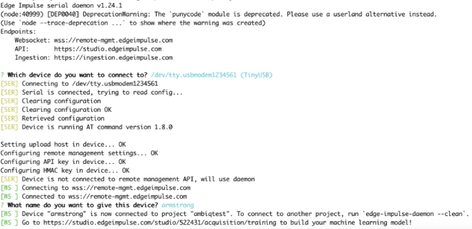 Run theedge-impulse-daemon and connect to your project, you will be prompted to name your device: