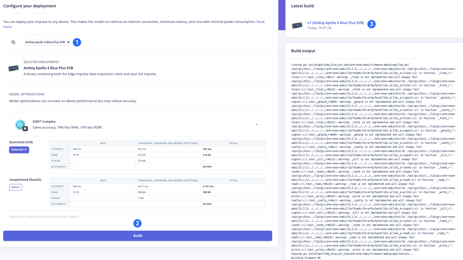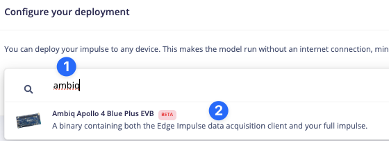 Edge Impulse firmwareThere is a firmware deployment option in Studio for the Apollo4 Blue Plus EVB. For the other Apollo4 boards, you will need to modify and recompile the firmware found in the Edge Impulse firmware-ambiq-apollo4 GitHub repo.