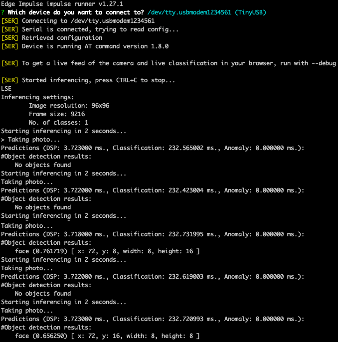 With everything set up you can now build your first machine learning model with these tutorials: If you flashed the pre-built binary with FOMO Face Detection example from above then just connect your board and runedge-impulse-run-impulse to see an output similar to this: