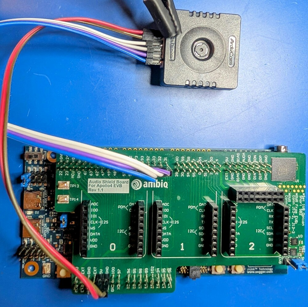 This step is only needed when using models requiring camera input. Skip this section if you are testing other models that do not need camera input. The ArduCam Mega 5MP SPI connects to the Apollo4 Plus EVB and Apollo4 Blue Plus KXR EVB pins as shown in the table below:| Camera Pin | EVB Pin |