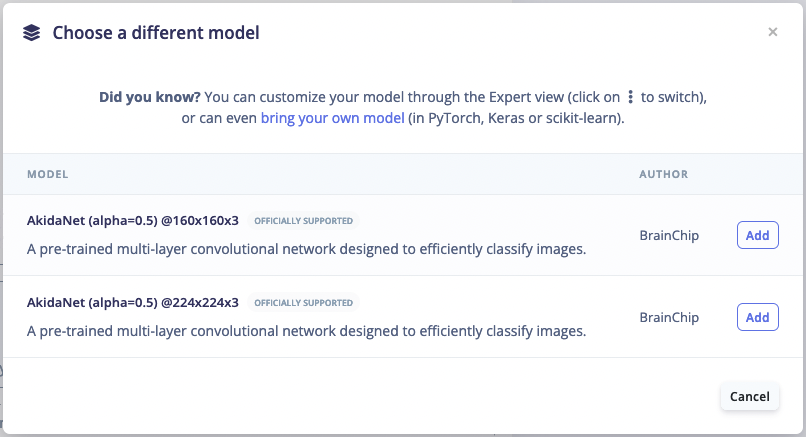 In the Learning Block of the Impulse Design one can compare between Float, Quantized, and Akida™ versions of a model. If you added a Processing Block to your Impulse Design you will need to generate features before you can train your model. If the project uses a transfer learning block you may be able to select a base model from BrainChip’s Model zoo to transfer learn from. More models will be available in the future, but if you have a specific request please let us know via the Edge Impulse forums.
