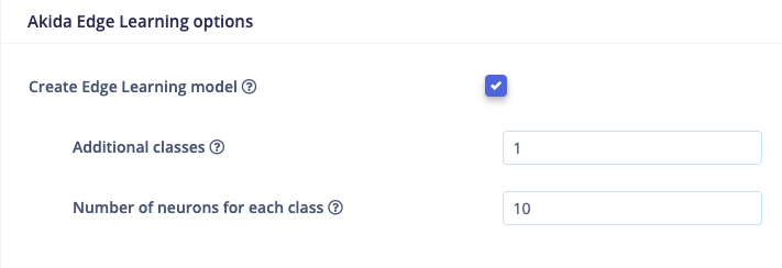 - Set the Additional classes and Number of neurons for each class and train the model. For more information about these parameters please visit BrainChip’s documentation of the parameters. Note that Edge Learning compatible models require a specific setup for the feature extractor and classification head of the model. You can view how a model is configured by switching to Keras (expert) mode in the Neural Network settings and searching for “Feature Extractor” and “Build edge learning compatible model” comments in the Keras code.