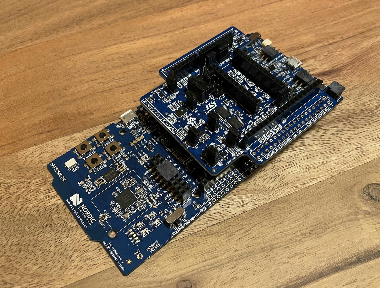 Remove the pin header protectors on the nRF52840 DK and plug the X-NUCLEO-IKS02A1 shield into the development board.