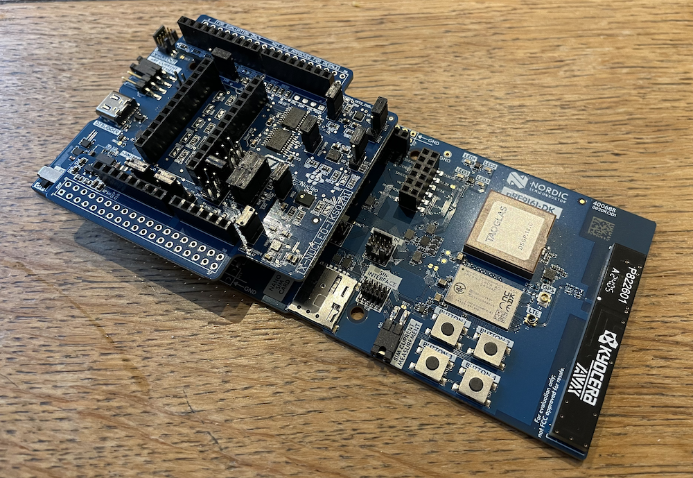 Remove the pin header protectors on the nRF9161 DK and plug the X-NUCLEO-IKS02A1 shield into the development board.