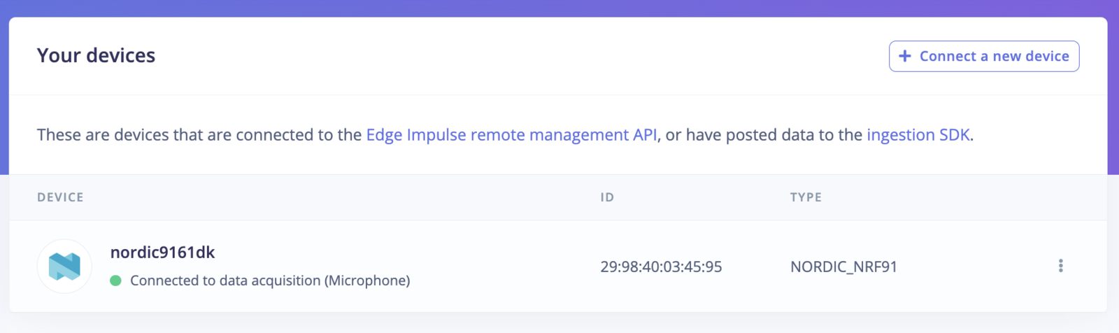 That’s all! Your device is now connected to Edge Impulse. To verify this, go to your Edge Impulse project, and click Devices. The device will be listed here.