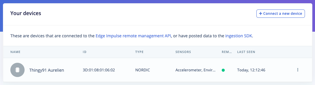 That’s all! Your device is now connected to Edge Impulse. To verify this, go to your Edge Impulse project, and click Devices. The device will be listed here.