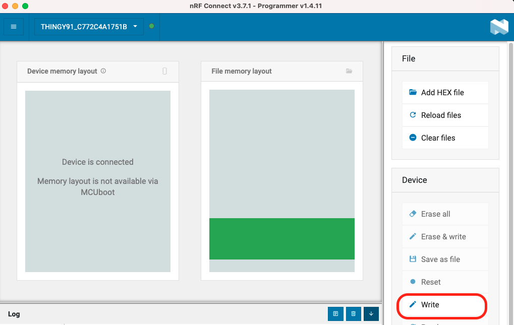 - In the MCUboot DFU window, click Write. When the update is complete, a Completed successfully message appears.