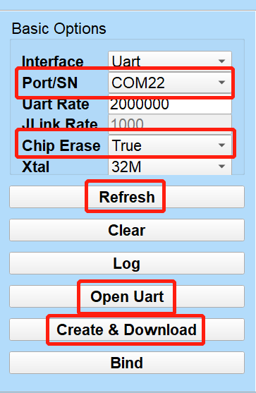 Click Refresh, choose the Port related to the connected board, set Chip Erase to True, click Open UART, click Create & Download and wait for the process to be completed .