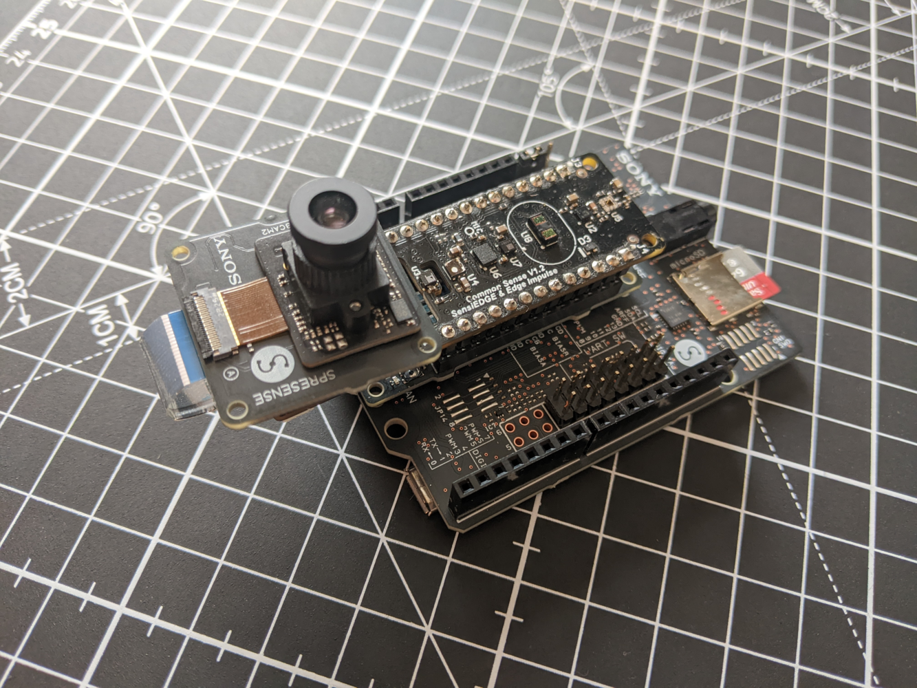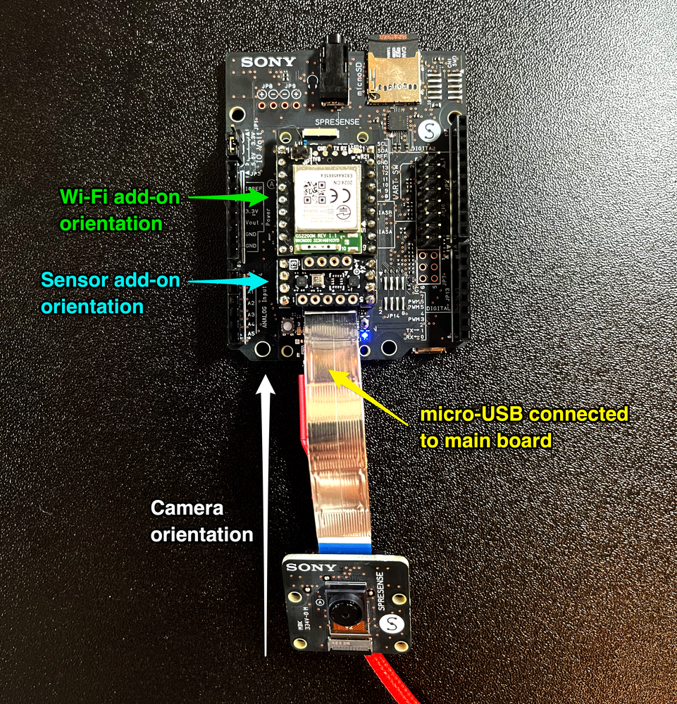 Connect the Sony Spresense extension board to the Sony Spresense ensuring that the micro-SD card is loaded. Connect the SensiEDGE CommonSense in the orientation shown below - with the connection ports facing the same direction. The HD camera is optional but can be attached if you want to create an image based application.