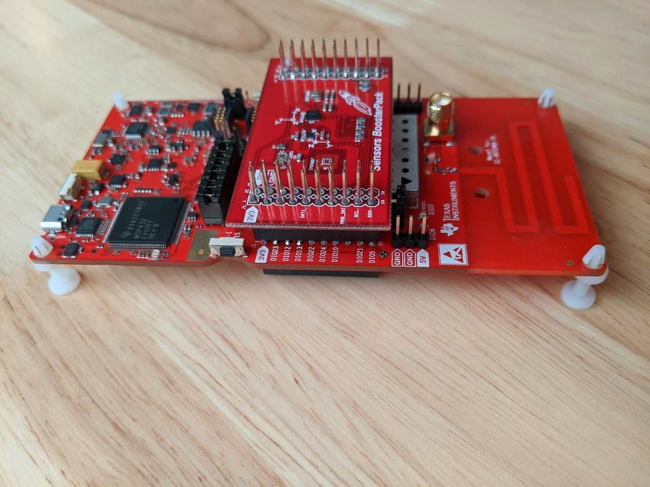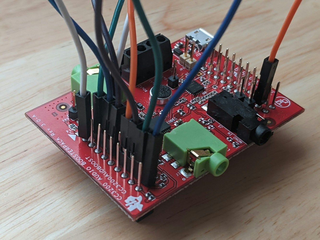 Connect the audio booster pack on top of the sensors booster pack. The final board should appear as shown below: