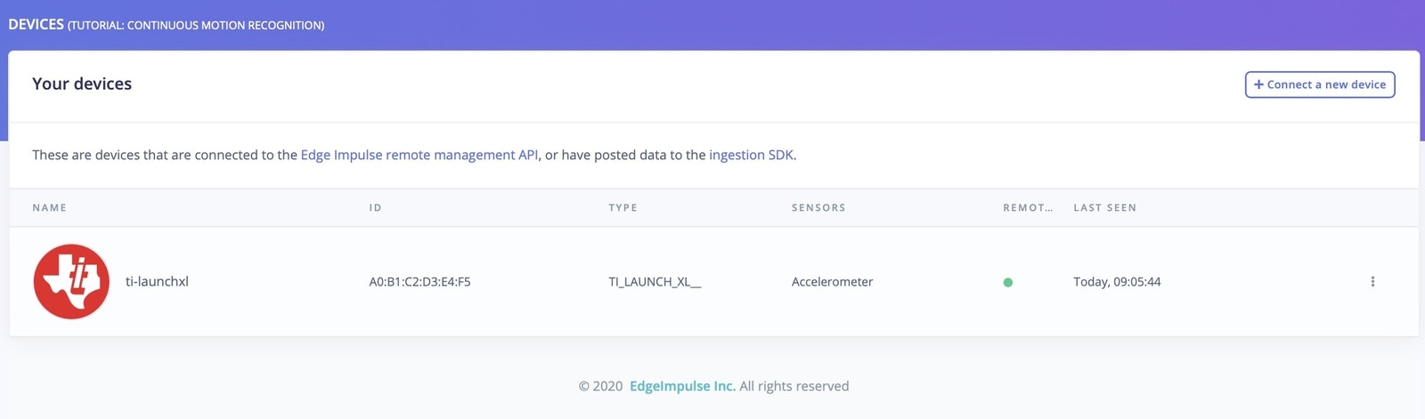 That’s all! Your device is now connected to Edge Impulse. To verify this, go to your Edge Impulse project, and click Devices. The device will be listed here.