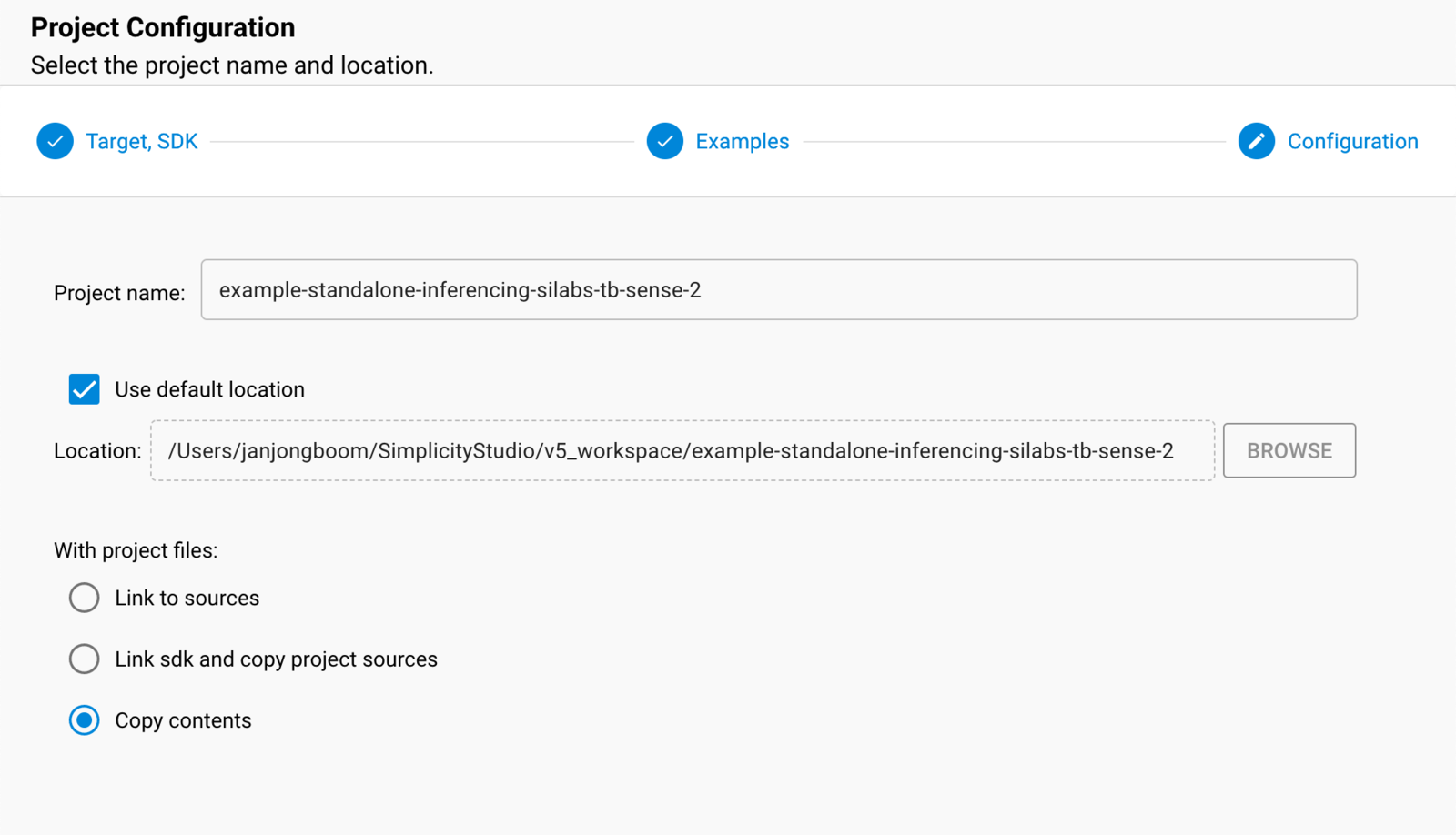 example-standalone-inferencing-silabs-tb-sense-2(exactly this) and make sure Copy contents is selected before clicking Finish.