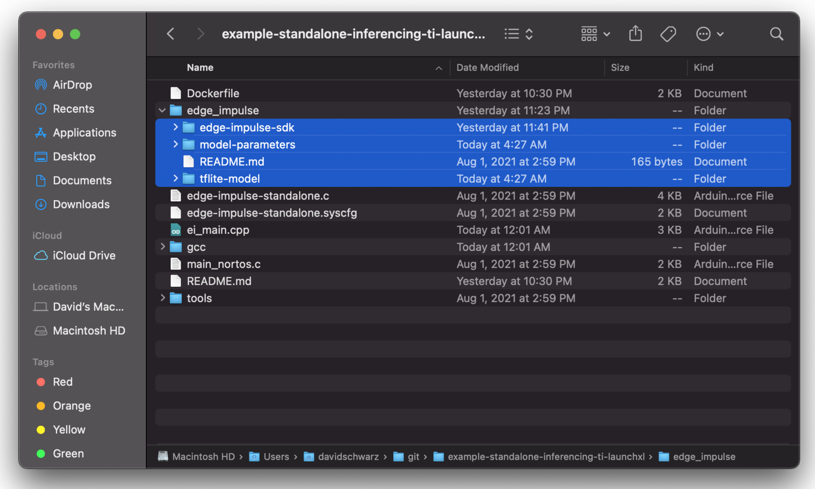 To add the impulse to your firmware project, paste the edge-impulse-sdk/, model-parameters and tflite-model directories from the downloaded ‘.zip’ file into the edge_impulse/ directory of the example-standalone-inferencing-ti-launchxl repository. Make sure to overwrite any existing files in the edge_impulse/ directory.