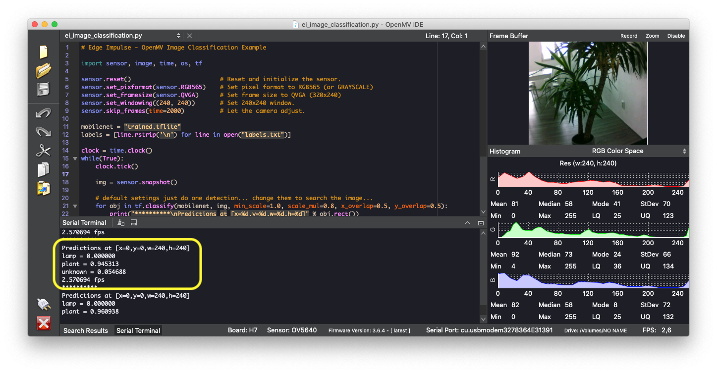 ei_image_classification.py file in the OpenMV IDE, and press the ‘Play’ icon to run the script.