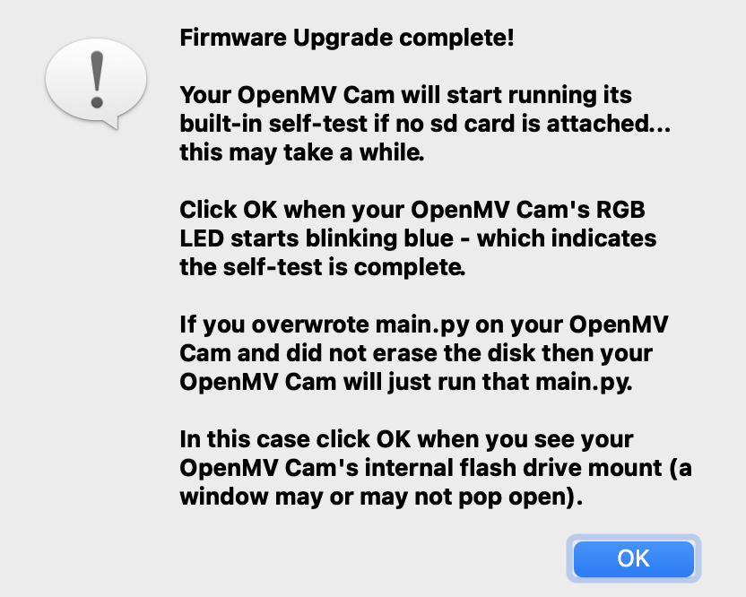 This method only works on small image classification models, if you run into a memory issue, please head to Deploying your impulse as an OpenMV firmware section (preferred method). Head over to your Edge Impulse project, and go to Deployment. From here you can create the full library which contains the impulse and all external required libraries. Select OpenMV library and click Build to create the library. Then download and extract the .zip file. To add the model to your OpenMV camera copy thetrained.tflite and labels.txt files to the ‘OpenMV Cam’ volume (like a USB drive).