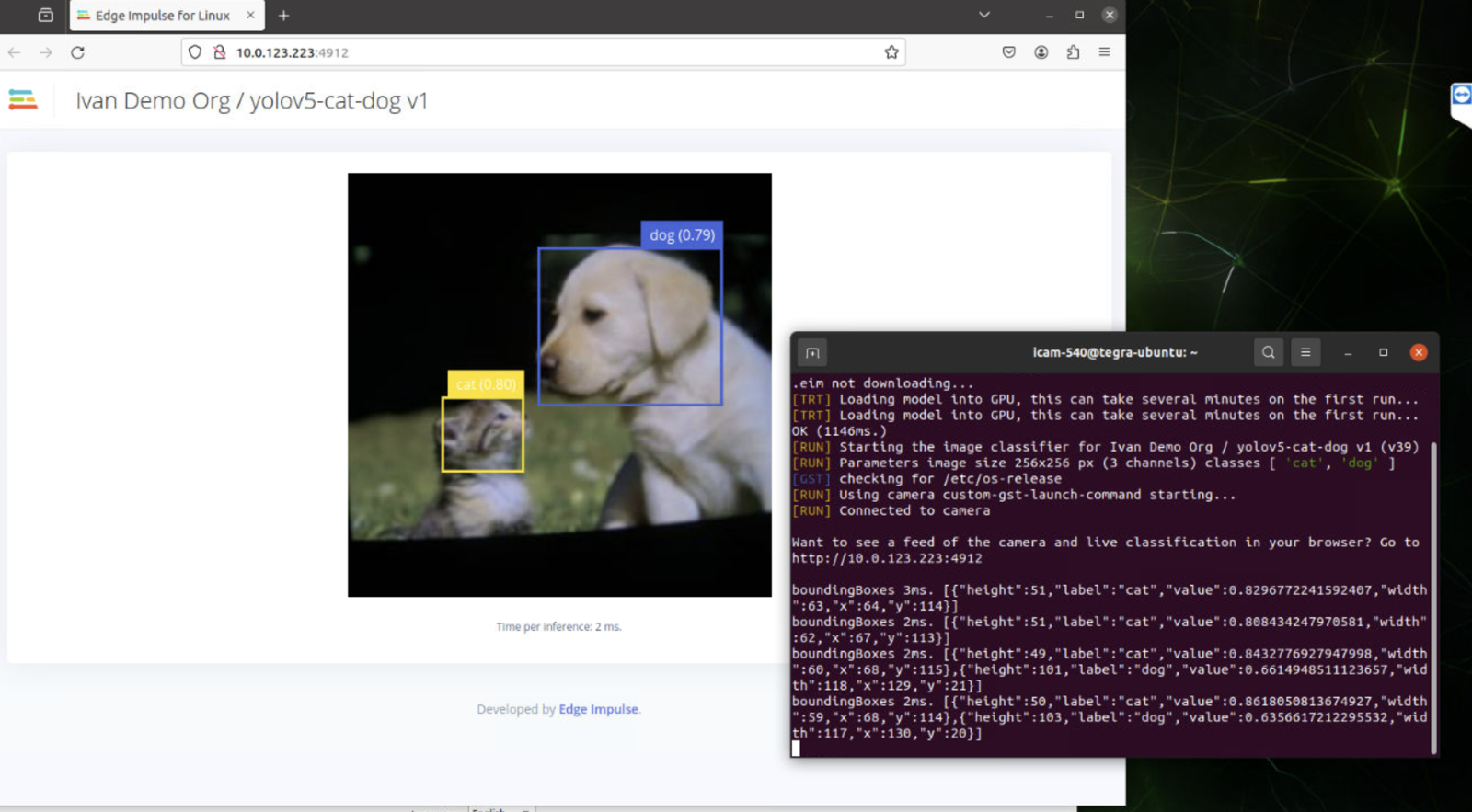 To run your impulse locally stop any previous Edge Impulse commands (CTRL+C) and run the following with the camera configurations you prefer (see above for info on camera configuration).