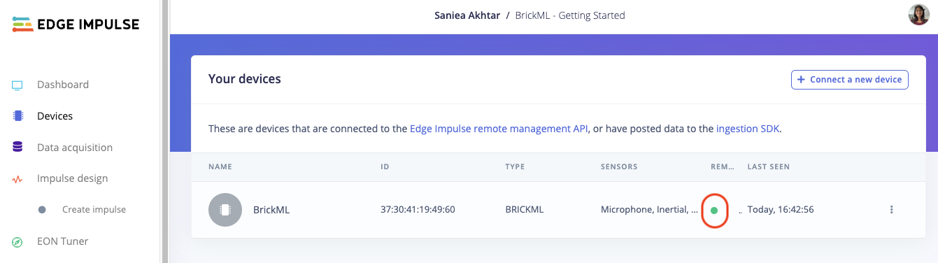 After the project is selected, the daemon will update to let you know that the connection is successful. Enter a name for your device at the prompt, and your device is now connected to the studio. The devices tab in your project on the studio will also indicate successful connection of the BrickML with a green indicator. You can now start collecting your data.\