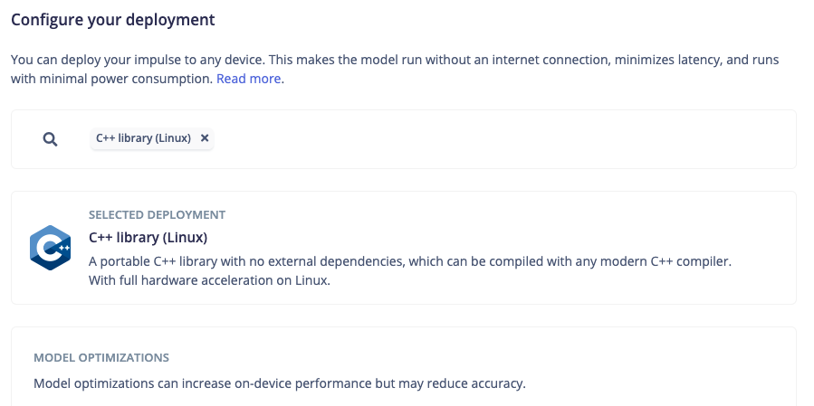 Go to the Deployment page of the Edge Impulse project that you will be testing with and select C++ Library (Linux).