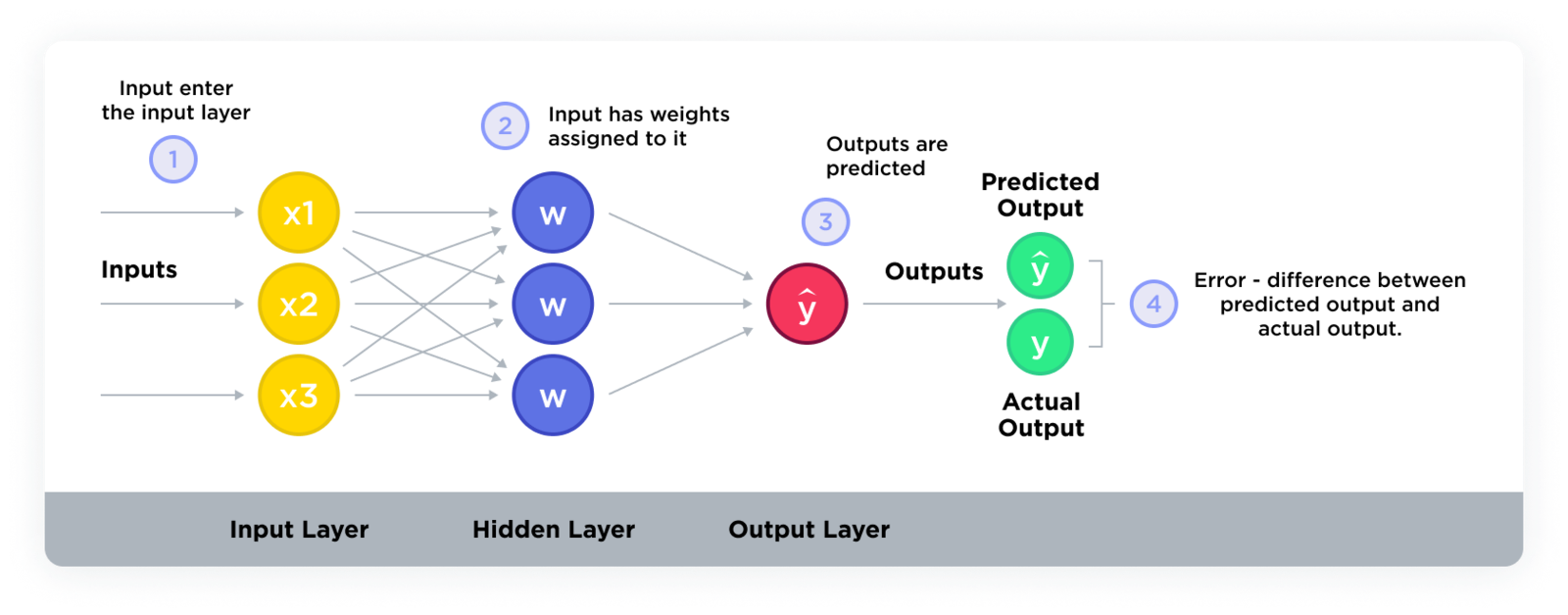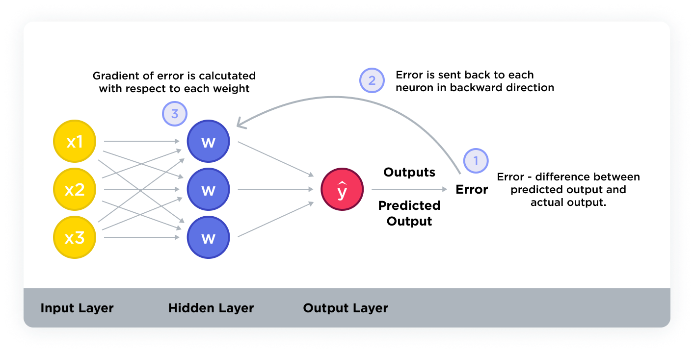 - Forward pass: For each example in the training dataset, the model makes a prediction (forward pass). This involves calculating the output of the model given its current weights and the input data.