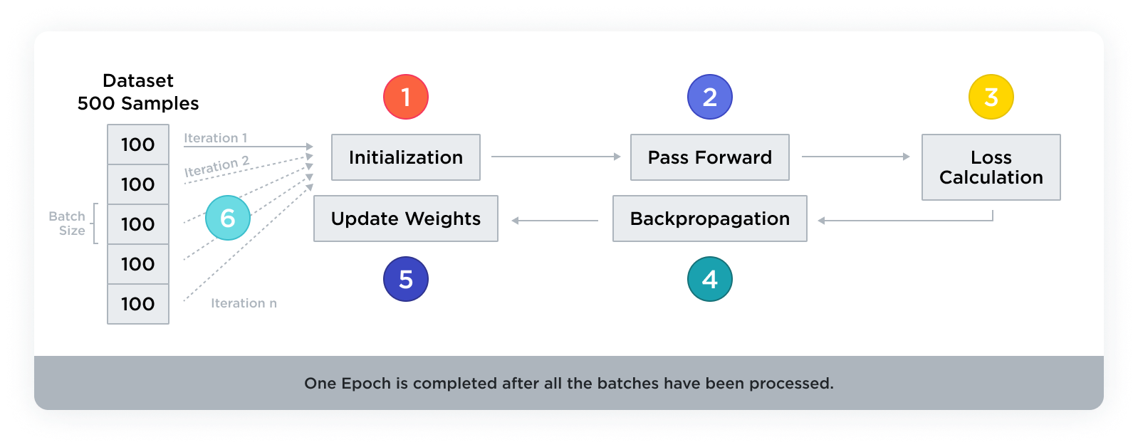 - Iteration over batches: An epoch consists of iterating over all batches in the dataset, performing the forward pass, loss calculation, backpropagation, and weight update for each batch.
