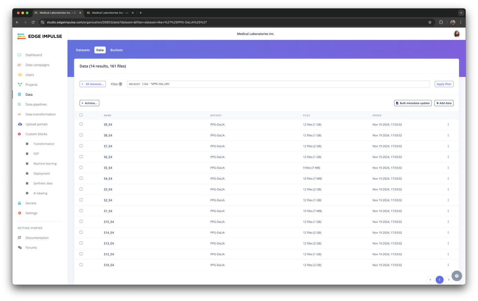 dataset like '%PPG%'- returns all items and files from the study.bucket_name = 'edge-impulse-health-reference-design' AND -- labels sitting,walking- returns data whose label is ‘sitting’ and ‘walking, and that is stored in the ‘edge-impulse-health-reference-design’ bucket.metadata->>'ei_check' = 0- return data that have a metadata field ‘ei_check’ which is ‘0’.created > DATE('2022-08-01')- returns all data that was created after Aug 1, 2022.