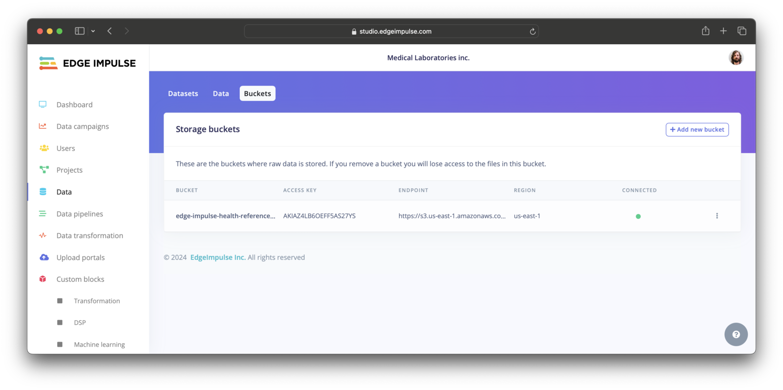 Data is stored in cloud storage buckets that are hosted in your own infrastructure. To configure a new storage bucket, head to your organization, choose Data > Buckets, click Add new bucket, and fill in your access credentials. For additional details, refer to Cloud data storage. Our solution engineers are also here to help you set up your buckets.