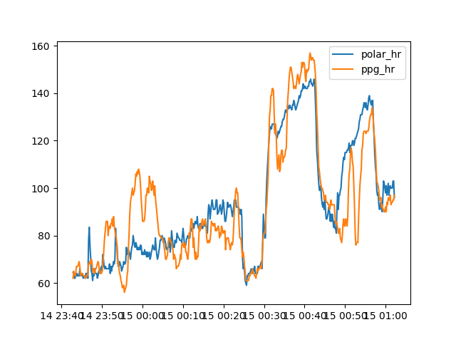 hr.pngfile with the correlation between HR found from PPG, and HR from the reference device. This is useful for two reasons:- If the correlation is too low we’re looking at the wrong file, or data is missing.