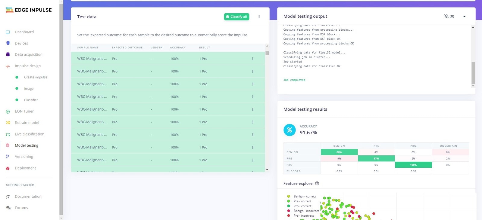 Let’s see how the model performs on unseen data. Head over to the Model testing tab where you will see all of the unseen test data available. Click on the Classify all and sit back as we test our model.