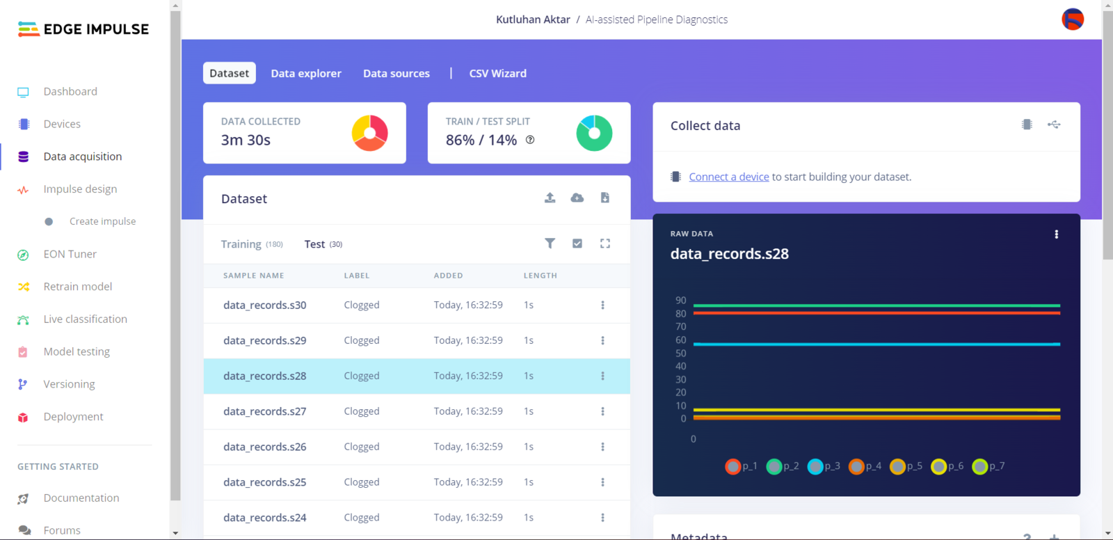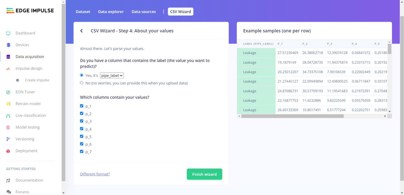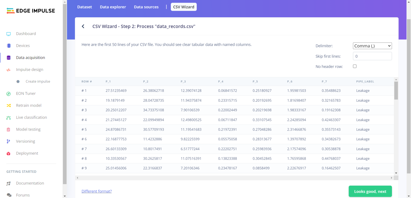 As long as the CSV file includes a header defining data fields, Edge Impulse can distinguish data records as individual samples in different data structures thanks to its CSV Wizard while adding existing data to an Edge Impulse project. Therefore, there is no need for splitting single CSV file data sets even if the data type is not time series. After collecting the extracted mmWave data parameters of different pipeline defects and generating a pre-formatted CSV file via the web application, I obtained my appropriately formatted samples.