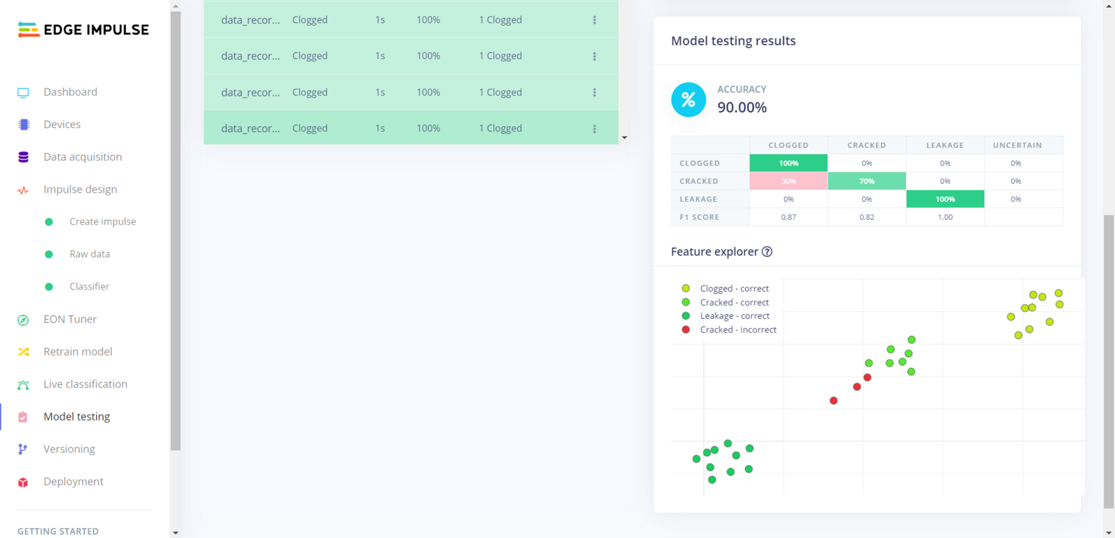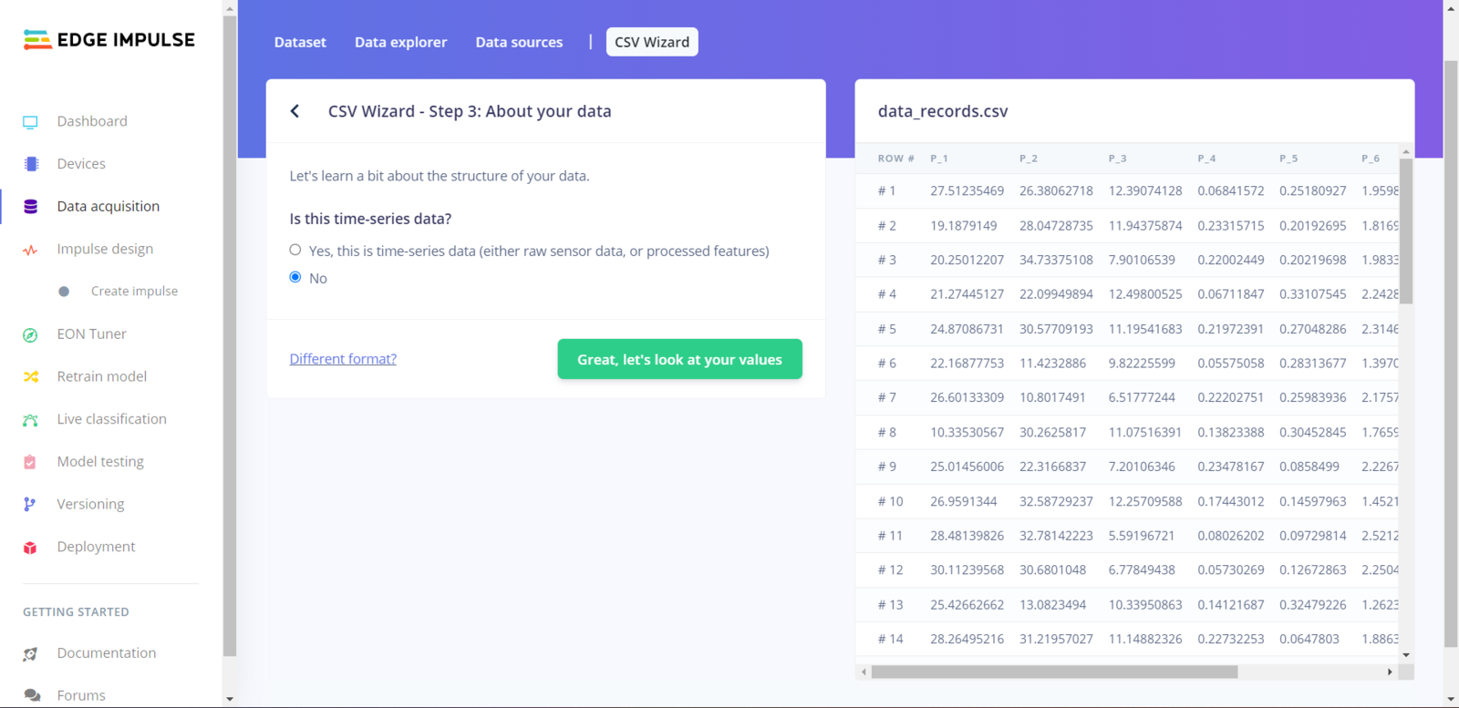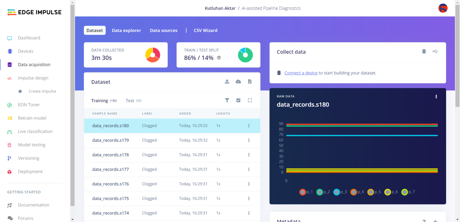 As long as the CSV file includes a header defining data fields, Edge Impulse can distinguish data records as individual samples in different data structures thanks to its CSV Wizard while adding existing data to an Edge Impulse project. Therefore, there is no need for splitting single CSV file data sets even if the data type is not time series. After collecting the extracted mmWave data parameters of different pipeline defects and generating a pre-formatted CSV file via the web application, I obtained my appropriately formatted samples.