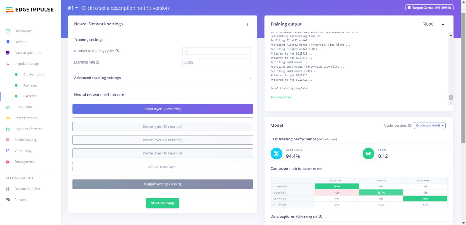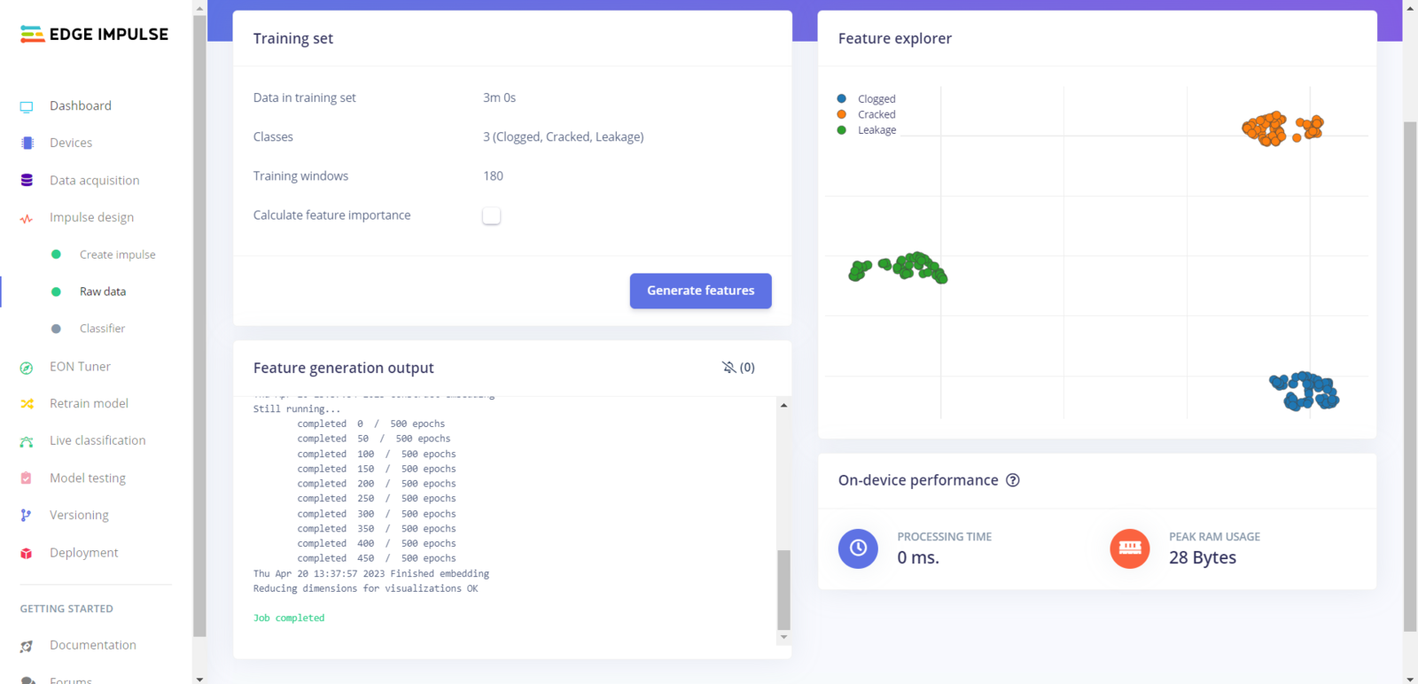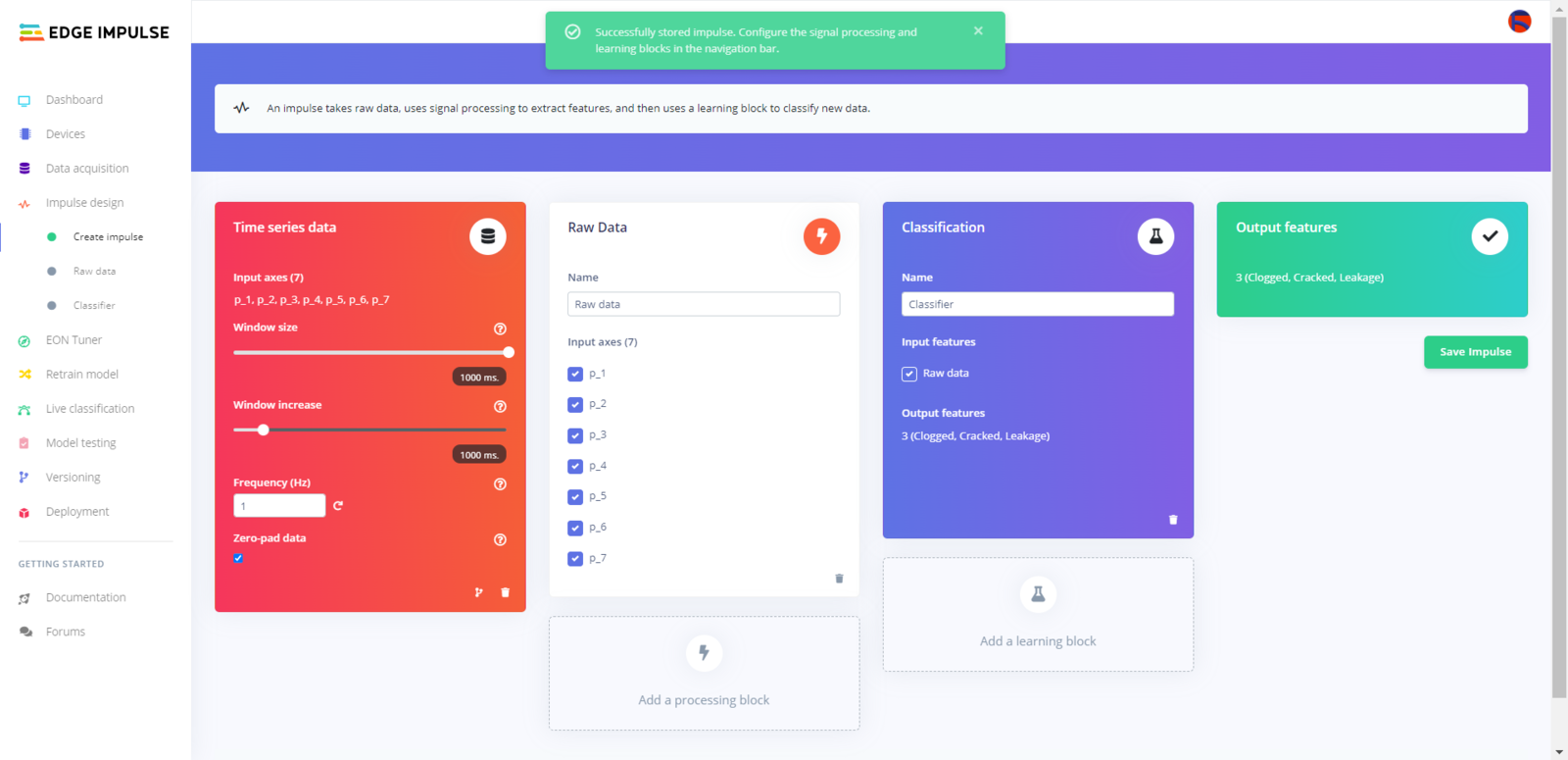 After uploading my training and testing samples successfully, I designed an impulse and trained it on pipeline diagnostic classes. An impulse is a custom neural network model in Edge Impulse. I created my impulse by employing the Raw Data processing block and the Classification learning block. The Raw Data processing block generate windows from data samples without any specific signal processing. The Classification learning block represents a Keras neural network model. Also, it lets the user change the model settings, architecture, and layers. :hash: Go to the Create impulse page. Then, select the Raw Data processing block and the Classification learning block. Finally, click Save Impulse.