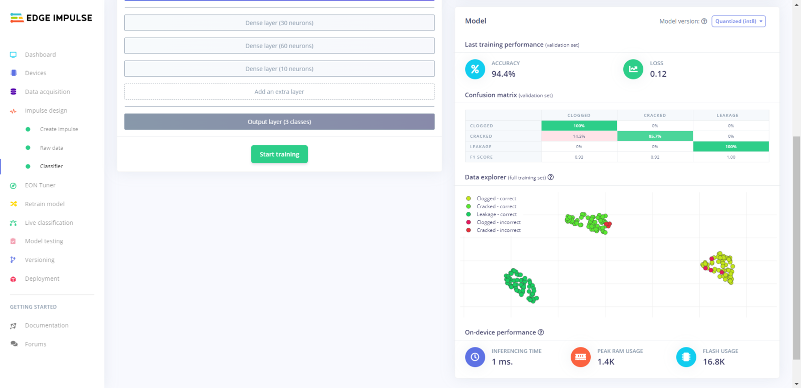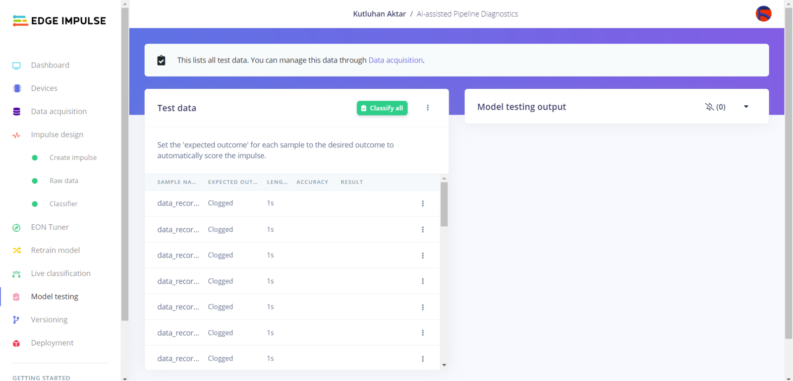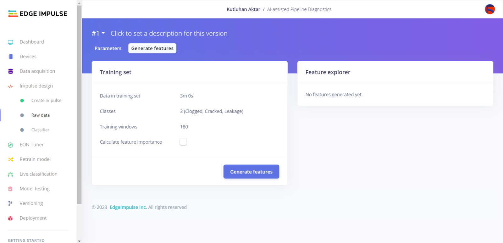 After uploading my training and testing samples successfully, I designed an impulse and trained it on pipeline diagnostic classes. An impulse is a custom neural network model in Edge Impulse. I created my impulse by employing the Raw Data processing block and the Classification learning block. The Raw Data processing block generate windows from data samples without any specific signal processing. The Classification learning block represents a Keras neural network model. Also, it lets the user change the model settings, architecture, and layers. :hash: Go to the Create impulse page. Then, select the Raw Data processing block and the Classification learning block. Finally, click Save Impulse.