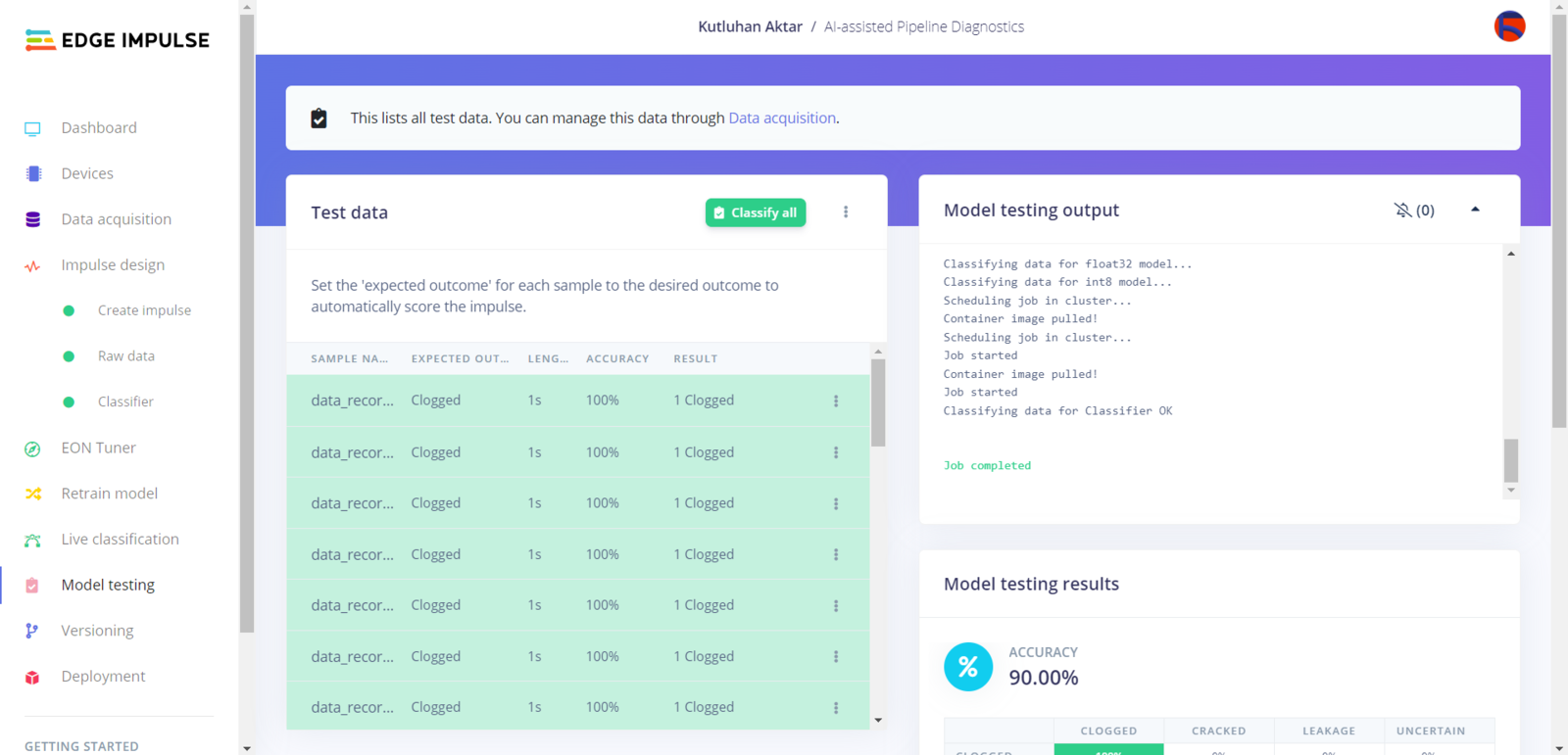 After building and training my neural network model, I tested its accuracy and validity by utilizing testing samples. The evaluated accuracy of the model is 90%. :hash: To validate the trained model, go to the Model testing page and click Classify all.