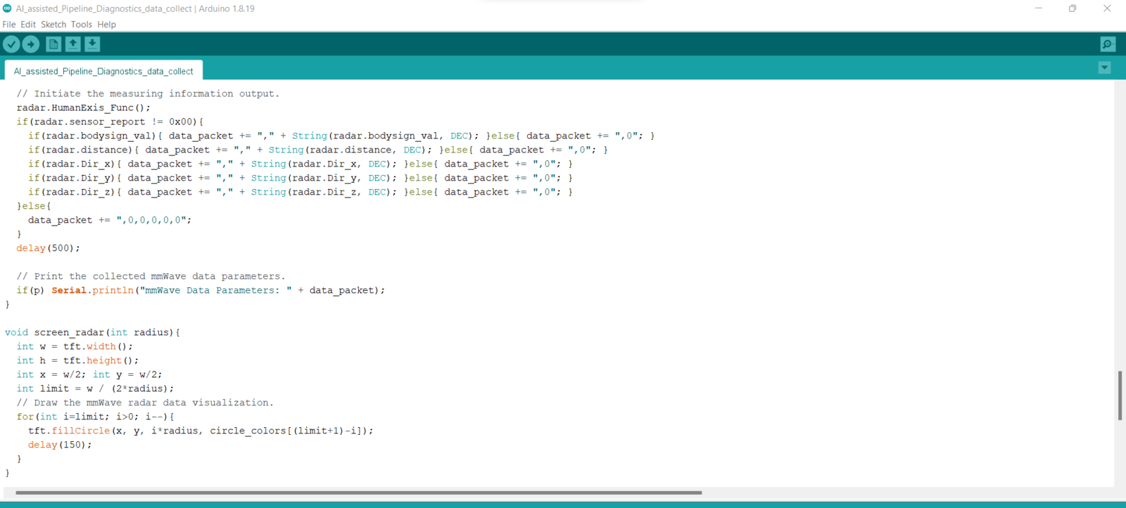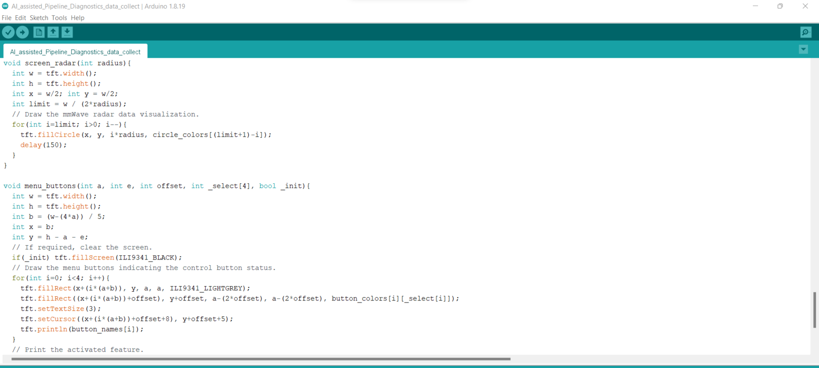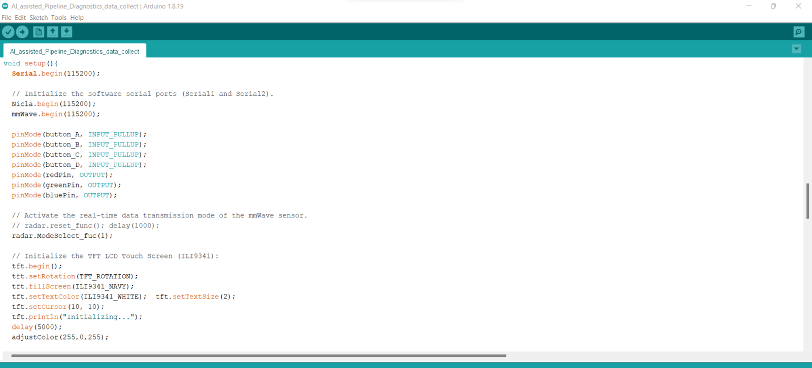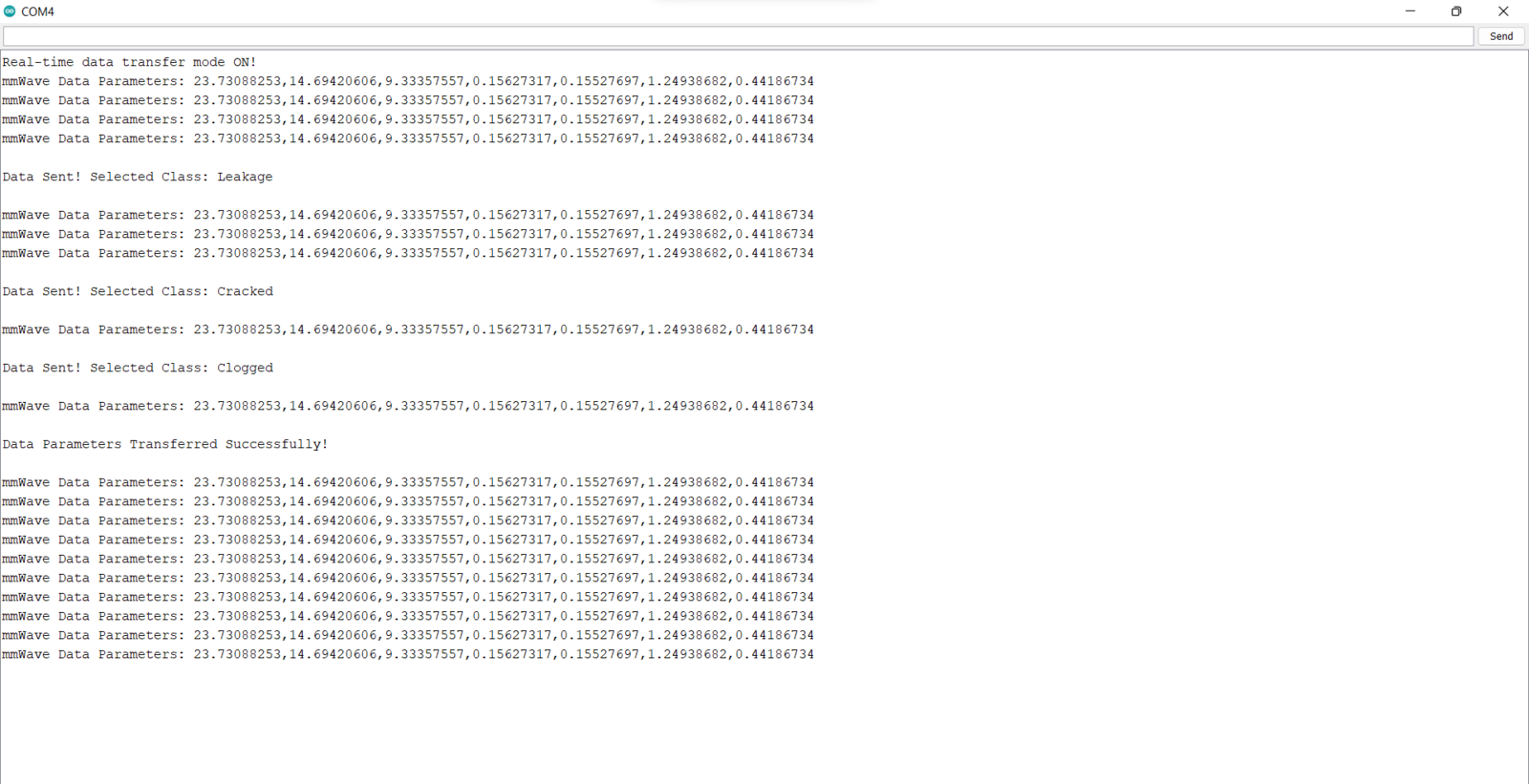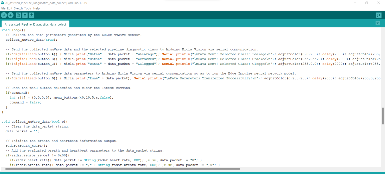 After setting up Nicla Vision and installing the required libraries, I programmed Arduino Nano to extract data parameters from the 60GHz mmWave radar module and transmit the collected data parameters to Nicla Vision via serial communication. As explained in the previous steps, I encountered architecture and library incompatibilities when I connected the mmWave module and the ILI9341 TFT LCD screen directly to Nicla Vision. Since I needed to assign pipeline diagnostic classes as labels for each data record while collecting mmWave data parameters of different pipeline defects to create a valid data set for my neural network model, I utilized three control buttons connected to Arduino Nano so as to choose among classes and transfer data records via serial communication. After selecting a pipeline diagnostic class by pressing a control button, Arduino Nano transmits the selected class and the recently collected data parameters to Nicla Vision.- Control Button (A) ➡ Leakage
