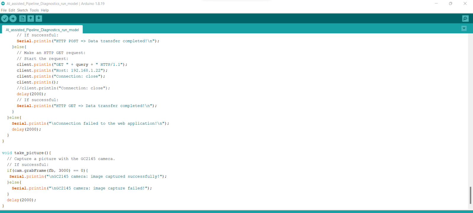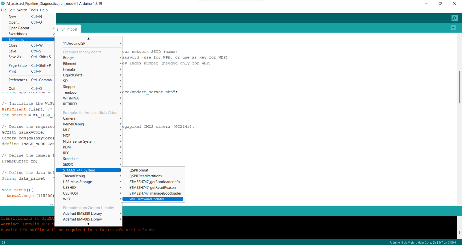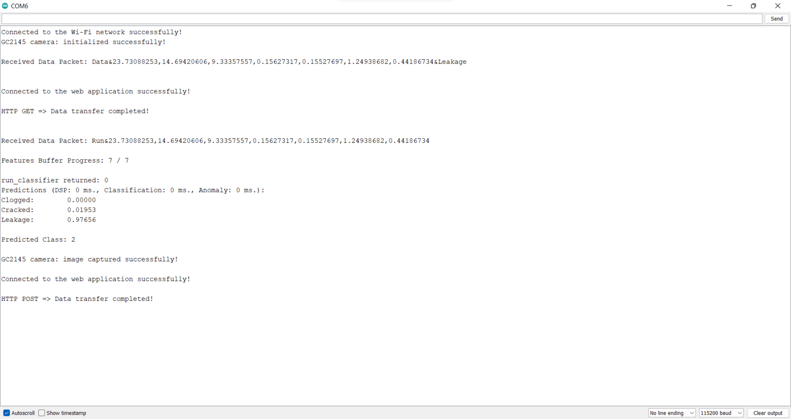 Step 8: Running the model on Nicla Vision to diagnose pipeline defects and transferring model results w/ captured images of the deformed pipes via POST requests