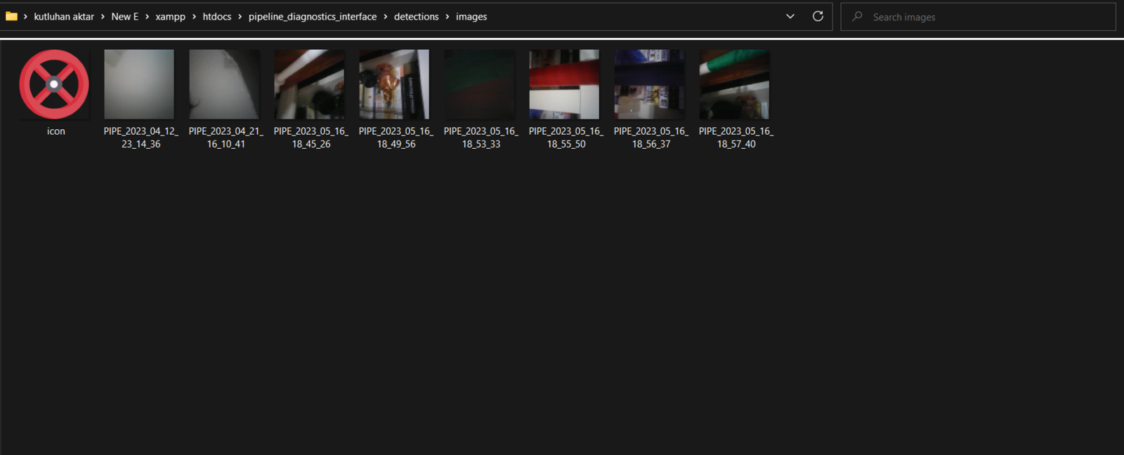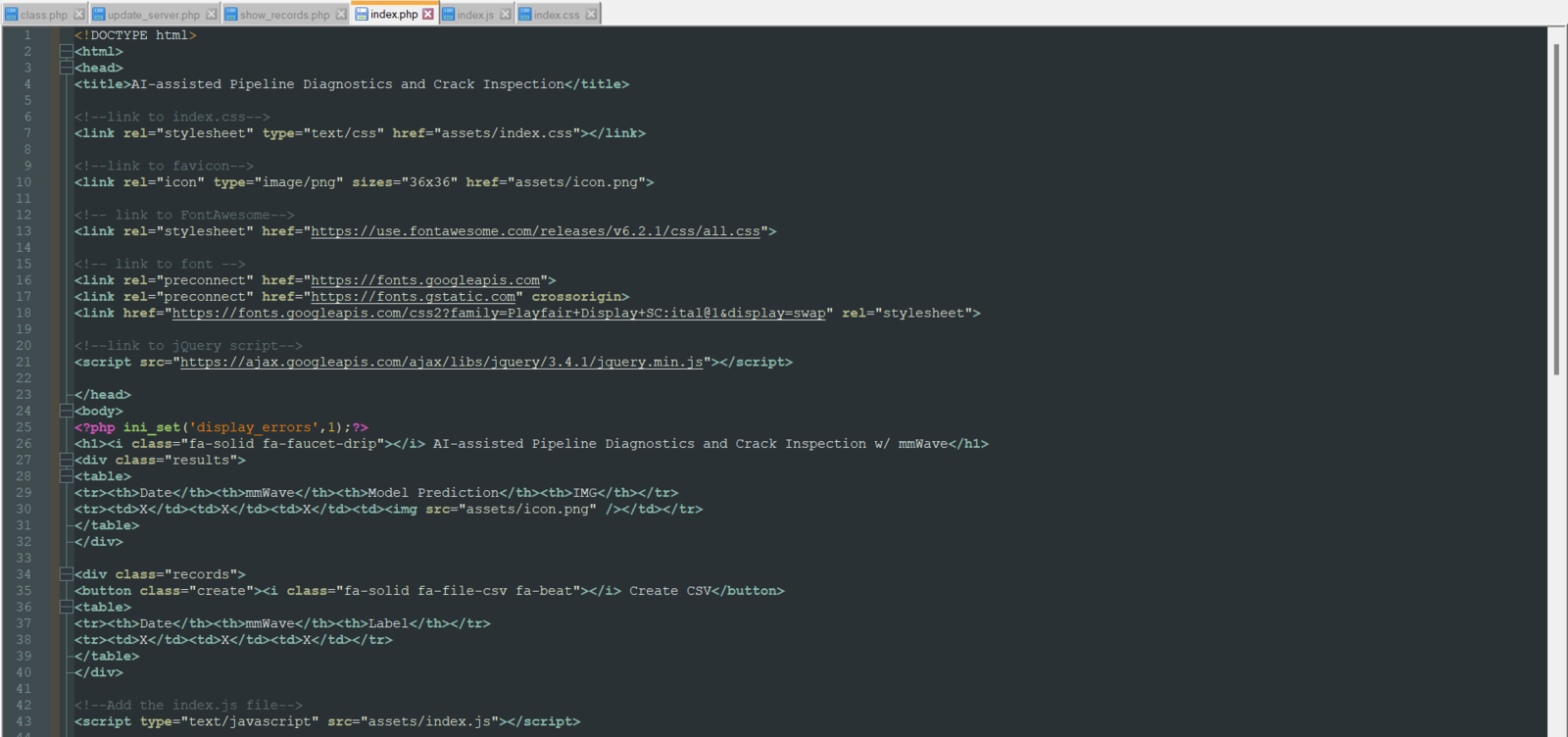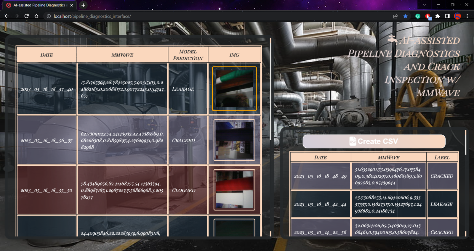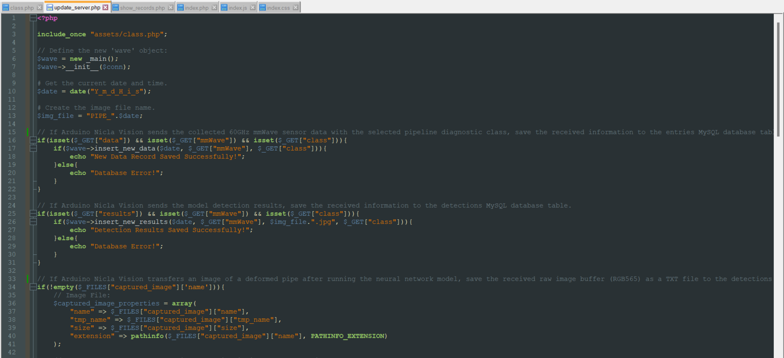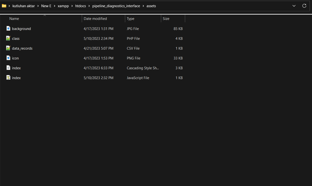 To provide an outstanding user interface for generating data samples and displaying model detection results, I developed a full-fledged web application from scratch in PHP, HTML, JavaScript, CSS, and MySQL. First of all, the web application obtains the extracted mmWave data parameters and the selected pipeline diagnostic class from Nicla Vision via an HTTP GET request. After storing the received information in a particular MySQL database table, the web application lets the user generate a CSV file, including all stored data records as samples. Also, the web application gets the inference data parameters, the diagnosed pipeline defect (class) by the neural network model, and the captured image of the deformed pipe from Nicla Vision via an HTTP POST request. After saving the received information to a particular MySQL database table for further inspection, the web application converts the received raw image buffer (RGB565) to a JPG file by executing a Python script. Then, the web application updates its interface automatically to show the latest stored information in database tables. On the interface, the application shows model detection results, the assigned detection images, and the collected data parameters in descending order so as to allow the user to check previous records easily. As shown below, the web application consists of three folders and seven code files:- /assets