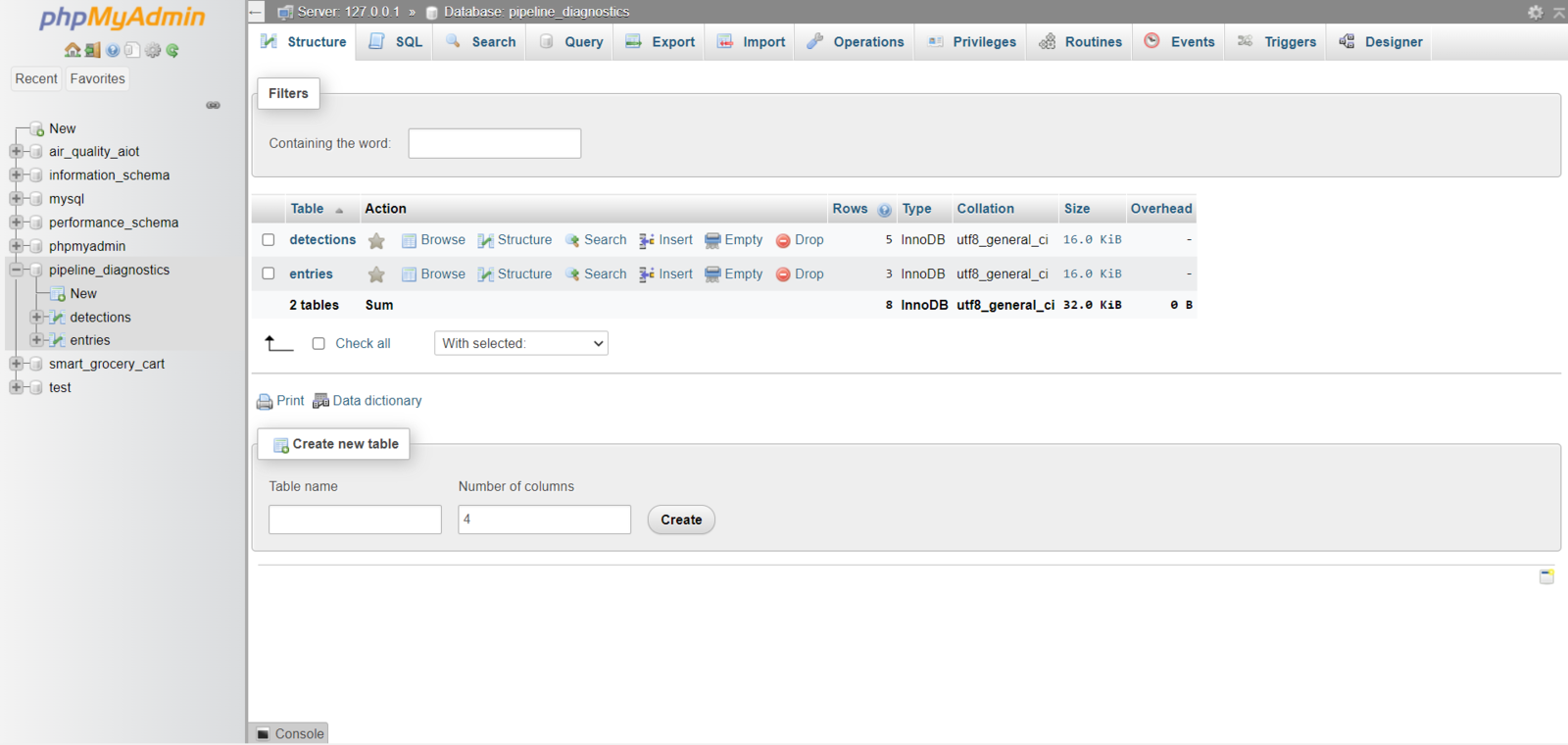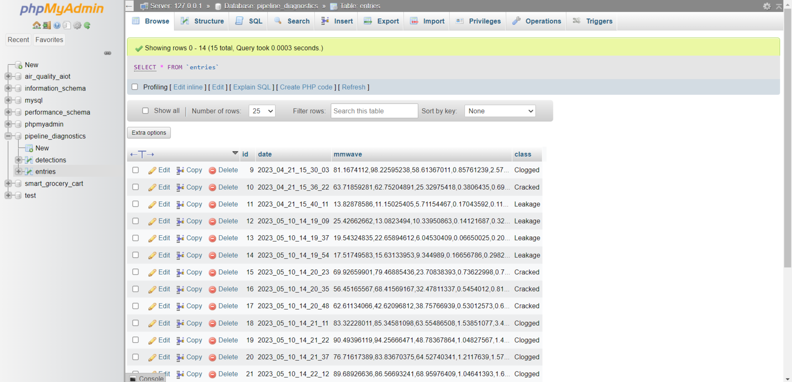 After setting the web application on LattePanda 3 Delta 864: 🚿🔎📲 The web application (update_server.php) saves the mmWave data parameters with the selected class transferred by Nicla Vision via an HTTP GET request to the entries MySQL database table. /pipeline_diagnostics_interface/update_server.php?data=OK&mmWave=32.06314106,65.51403019,27.04366461,0.59400105,0.58607824,5.429632,0.81743312&class=Cracked