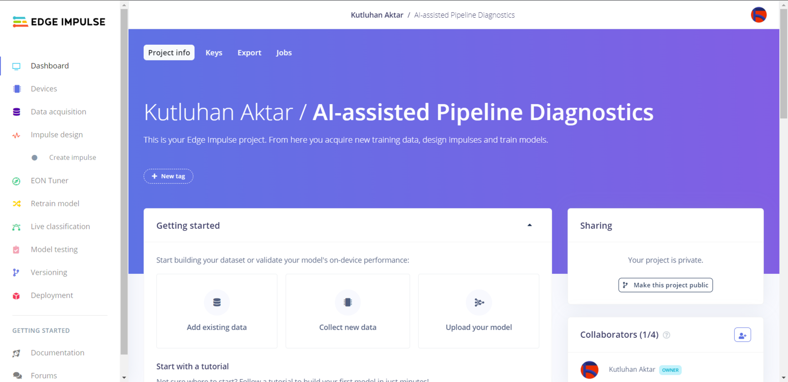 After generating training and testing samples successfully, I uploaded them to my project on Edge Impulse. :hash: First of all, sign up for Edge Impulse and create a new project.