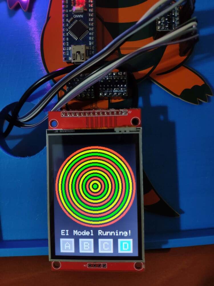 After uploading and running the code for collecting mmWave data parameters and transferring the collected data with the selected class to Nicla Vision via serial communication: 🚿🔎📲 If the 60GHz mmWave radar module works accurately, the device turns the RGB LED to magenta and displays the simple radar indicator visualizing the extracted mmWave data parameters and the interface menu buttons on the ILI9341 TFT LCD screen.