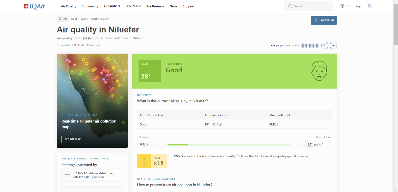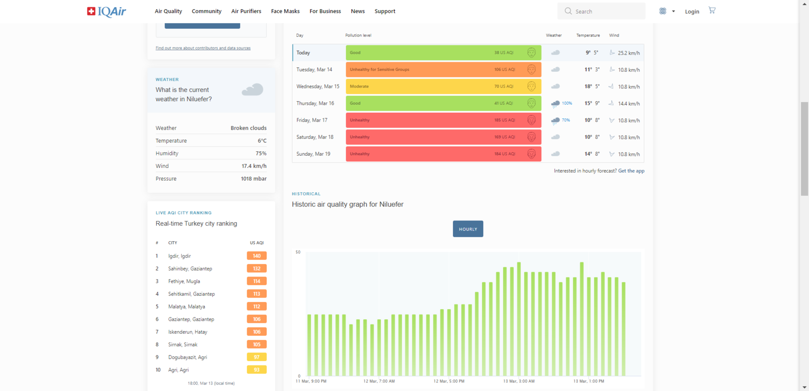 In this project, I needed to utilize accurate air pollution levels for each data record composed of the air quality data I collected. Therefore, I needed to obtain local Air Quality Index (AQI) estimations for my region. Since IQAir calculates the Air Quality Index (AQI) estimations based on satellite PM2.5 data for locations lacking ground-based air monitoring stations and provides hourly AQI estimations with air quality levels by location, I decided to employ IQAir to obtain local AQI estimations. Before collecting and storing the air quality data, I checked IQAir for the AQI estimation of my region. Then, I derived an air pollution class (level) from the AQI estimation provided by IQAir in order to assign a label empirically to my samples (data records).- Clean