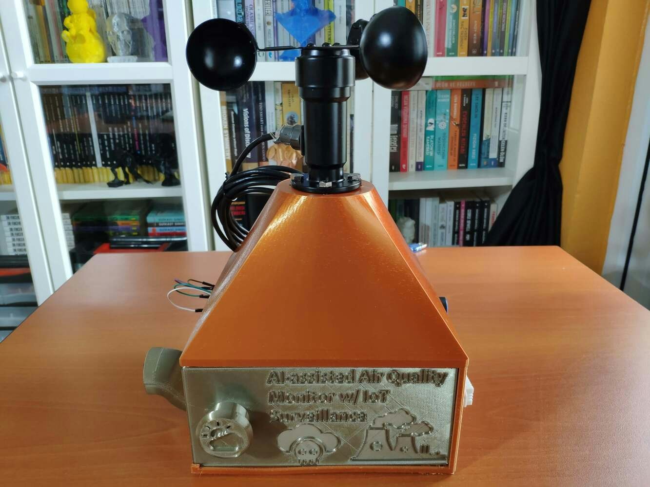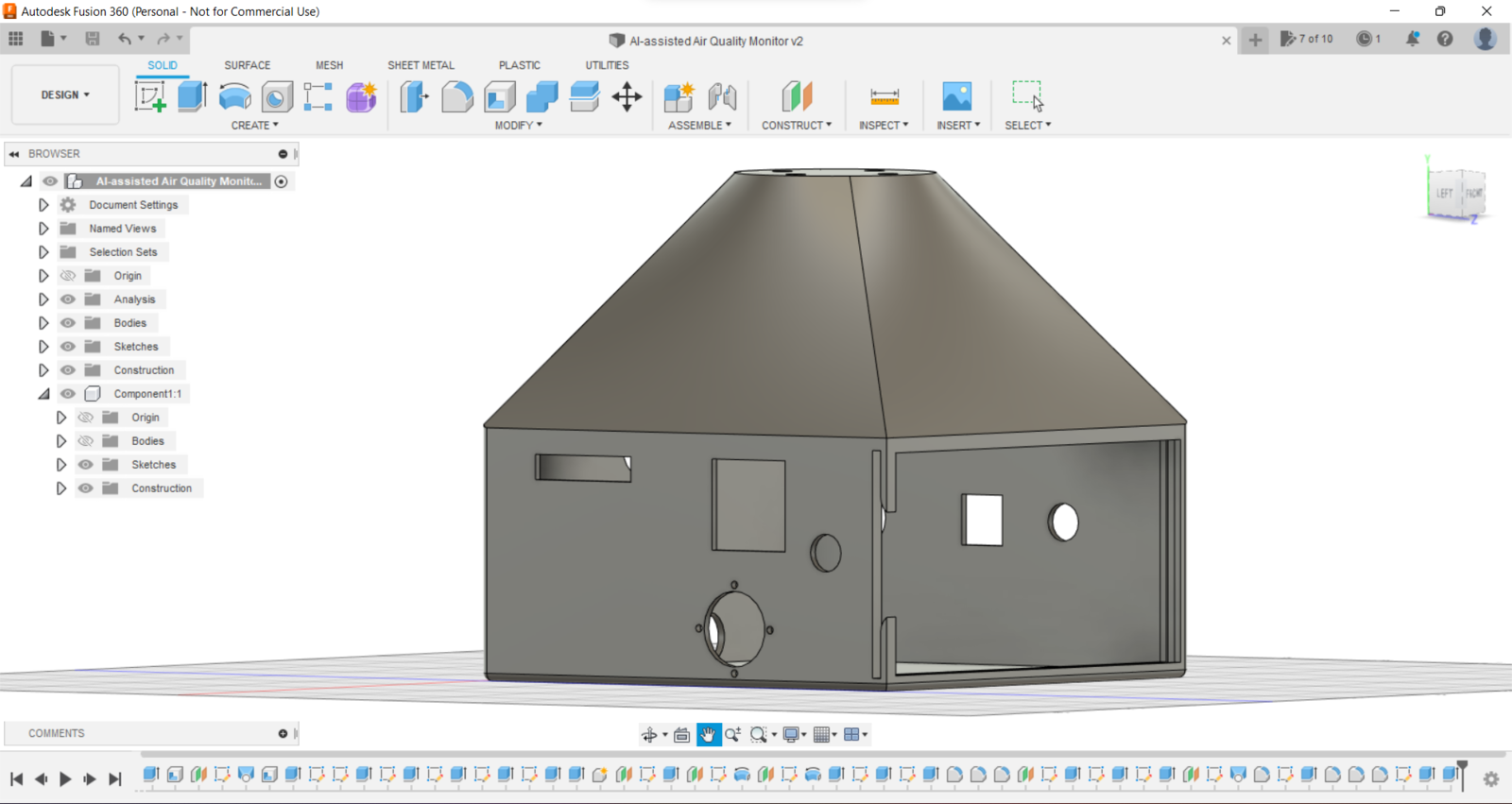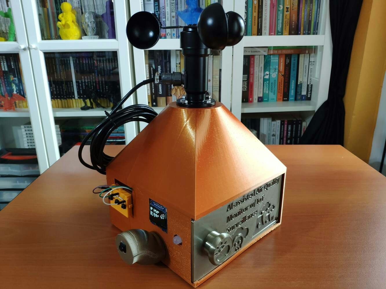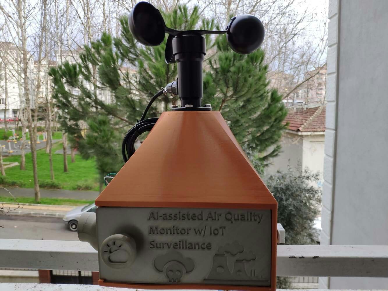 Since I focused on building a budget-friendly and accessible air station that collects air quality data and runs a neural network model to inform the user of air pollution via a PHP web application, I decided to design a sturdy and compact metallic case allowing the user to access the SD card after logging data, place the air quality sensors, and adjust the OV7725 camera effortlessly. To avoid overexposure to dust and prevent loose wire connections, I added a sliding front cover with a handle to the case. Then, I designed a separate camera holder mountable to the left side of the case at four different angles. Also, I decided to inscribe air pollution indicators on the sliding front cover to highlight the imminent pollution risk. Since I needed to attach an anemometer to the case to collect wind speed data, I decided to design a semi-convex structure for the case. This unique shape also serves as a wind deflector that protects the air quality sensors from potential wind damage. I designed the metallic air station case, its sliding front cover, and the mountable camera holder in Autodesk Fusion 360. You can download their STL files below.