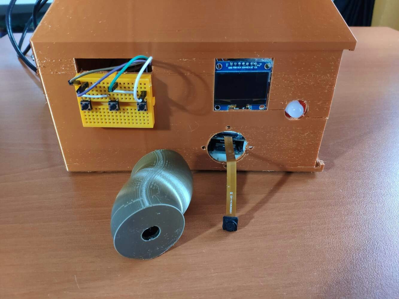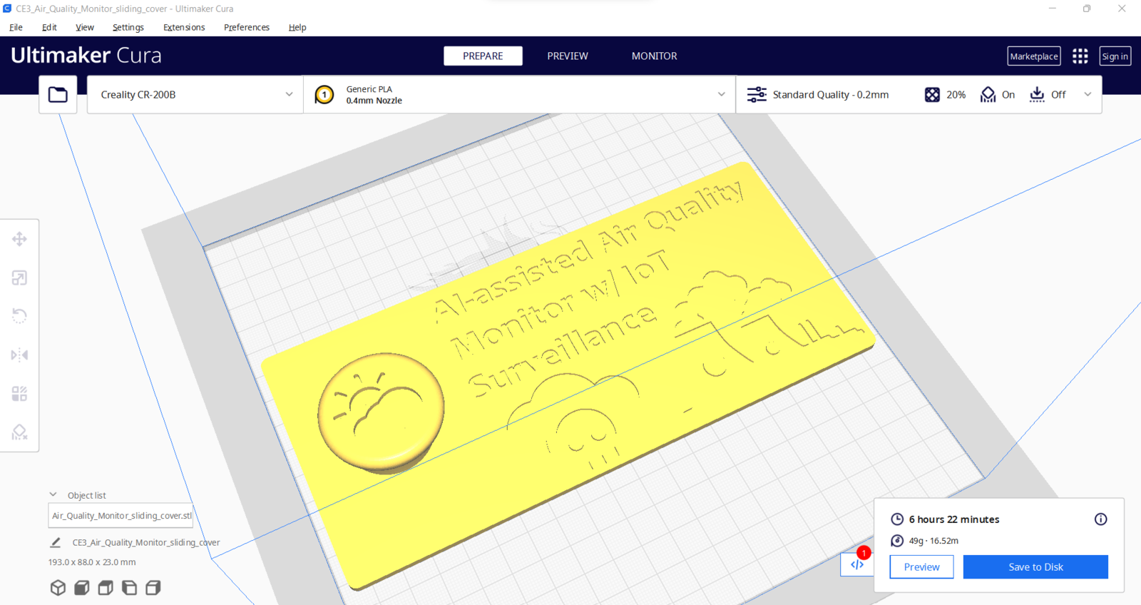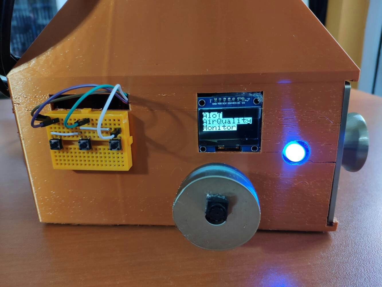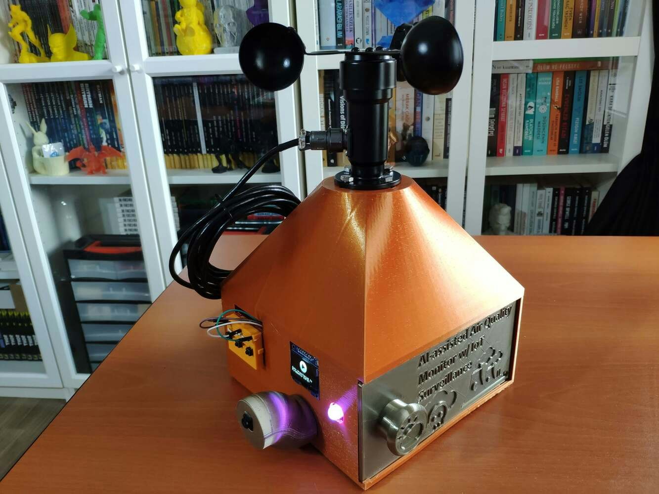 Since I focused on building a budget-friendly and accessible air station that collects air quality data and runs a neural network model to inform the user of air pollution via a PHP web application, I decided to design a sturdy and compact metallic case allowing the user to access the SD card after logging data, place the air quality sensors, and adjust the OV7725 camera effortlessly. To avoid overexposure to dust and prevent loose wire connections, I added a sliding front cover with a handle to the case. Then, I designed a separate camera holder mountable to the left side of the case at four different angles. Also, I decided to inscribe air pollution indicators on the sliding front cover to highlight the imminent pollution risk. Since I needed to attach an anemometer to the case to collect wind speed data, I decided to design a semi-convex structure for the case. This unique shape also serves as a wind deflector that protects the air quality sensors from potential wind damage. I designed the metallic air station case, its sliding front cover, and the mountable camera holder in Autodesk Fusion 360. You can download their STL files below.
