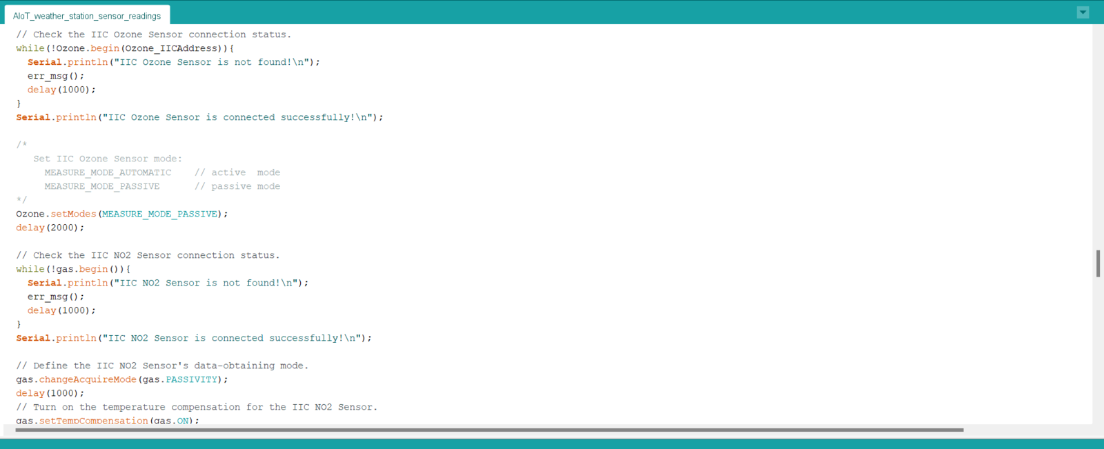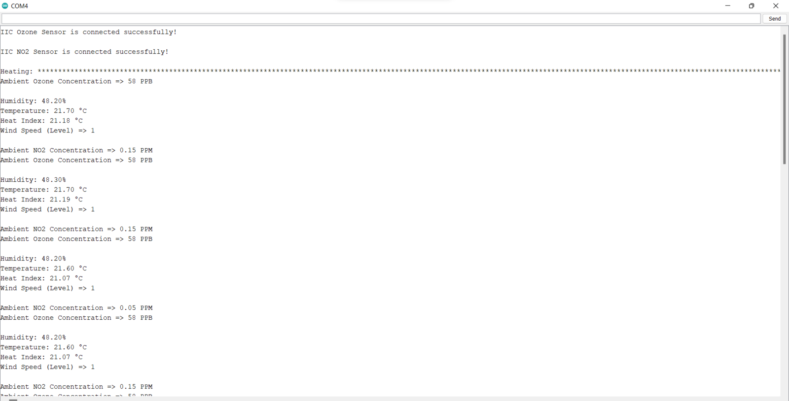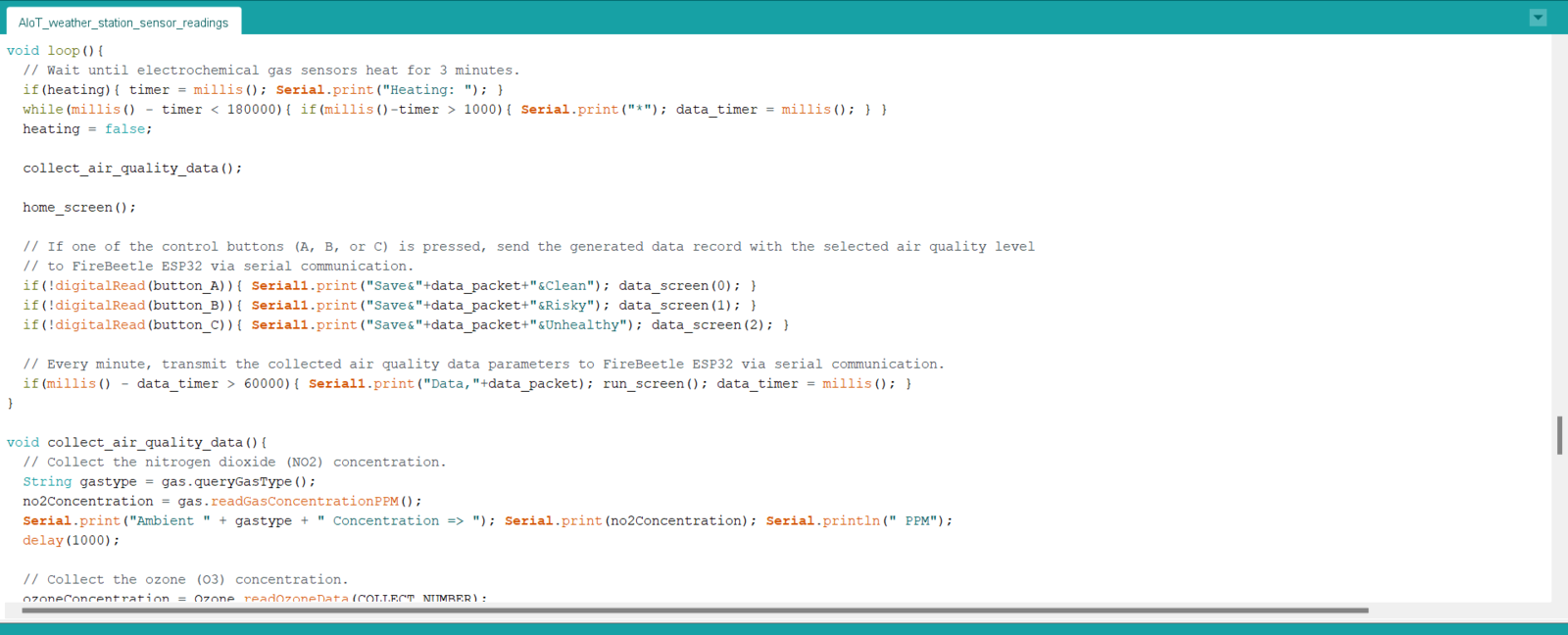 After setting up FireBeetle ESP32 and installing the required libraries, I programmed Arduino Mega to collect air quality data and transmit the collected data to FireBeetle ESP32 via serial communication. As explained in the previous steps, I encountered Arduino library incompatibilities and memory allocation issues when I connected the sensors directly to FireBeetle ESP32.- Nitrogen dioxide concentration (PPM)