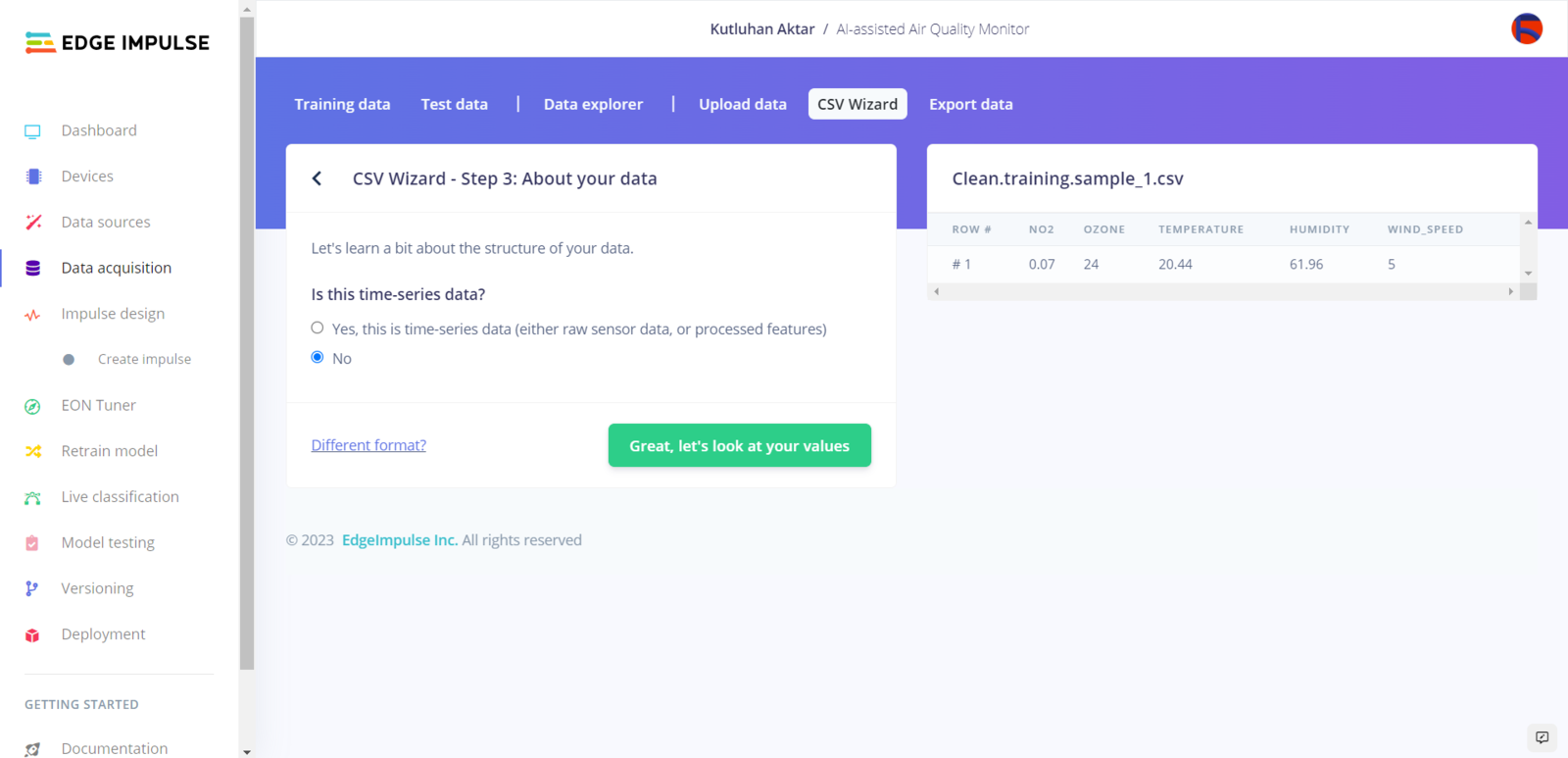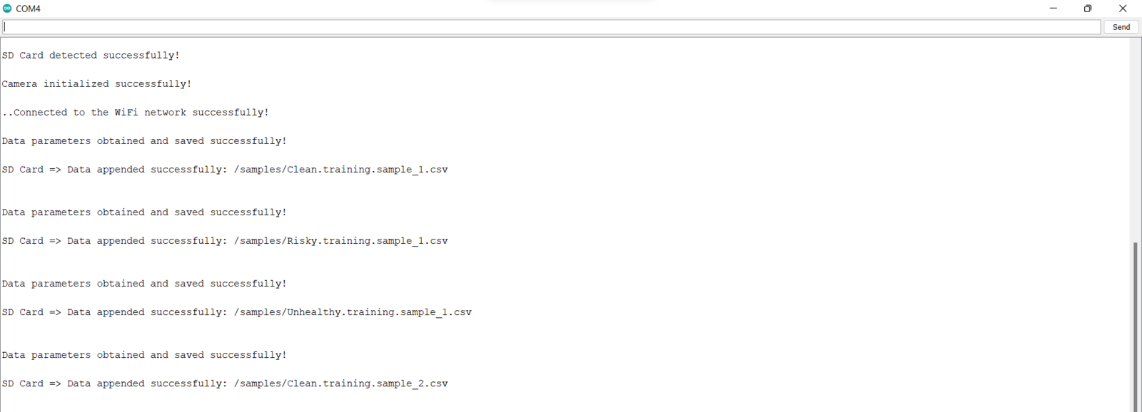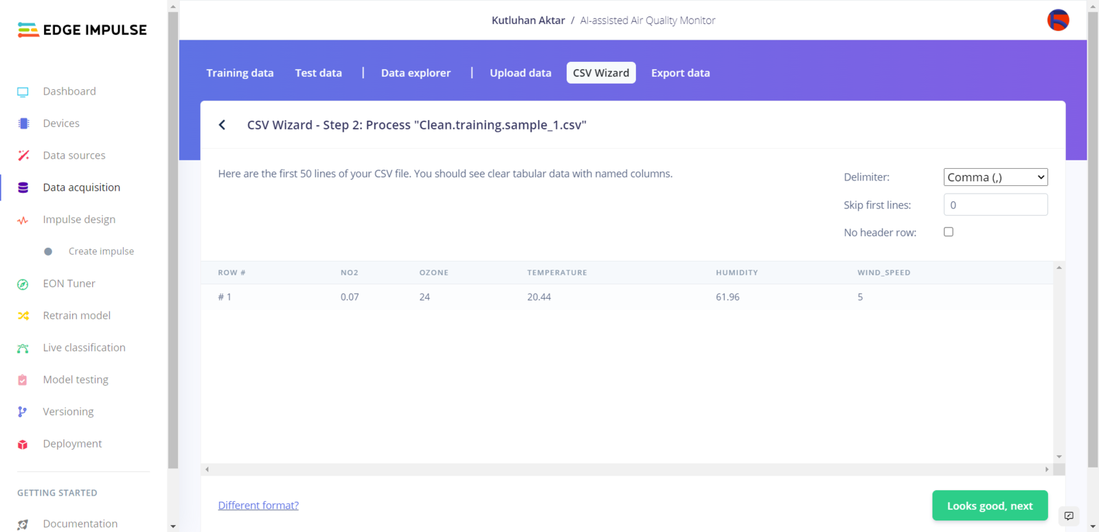 As long as the CSV file includes a header defining data fields, Edge Impulse can distinguish data records as individual samples in different data structures thanks to its CSV Wizard while adding existing data to an Edge Impulse project. Therefore, there is no need for preprocessing single CSV file data sets even if the data type is not time series. Since Edge Impulse can infer the uploaded sample’s label from its file name, I employed FireBeetle ESP32 to create a new CSV file for each data record and name the generated files by combining the given air pollution level and the sample number incremented by 1 for each class (label) automatically.- Clean.training.sample_1.csv