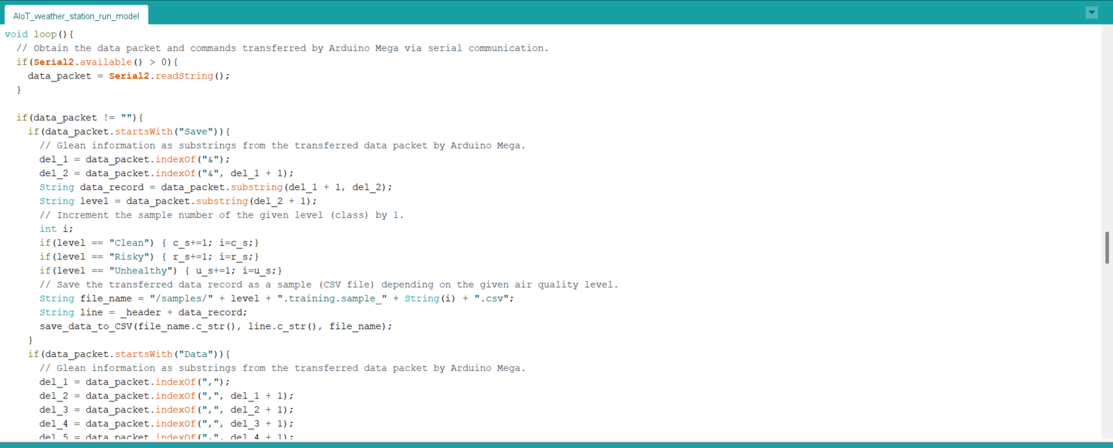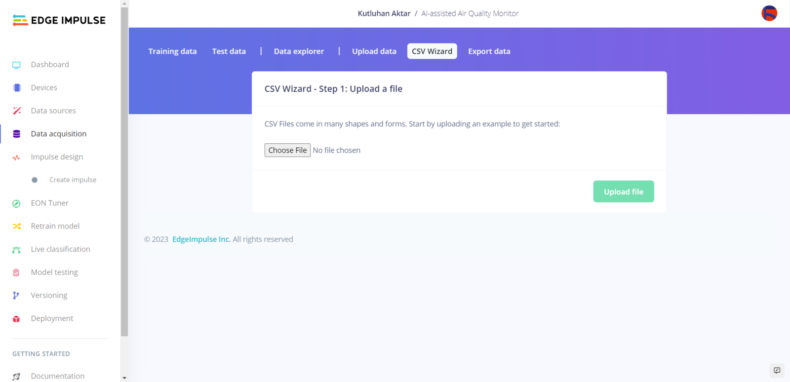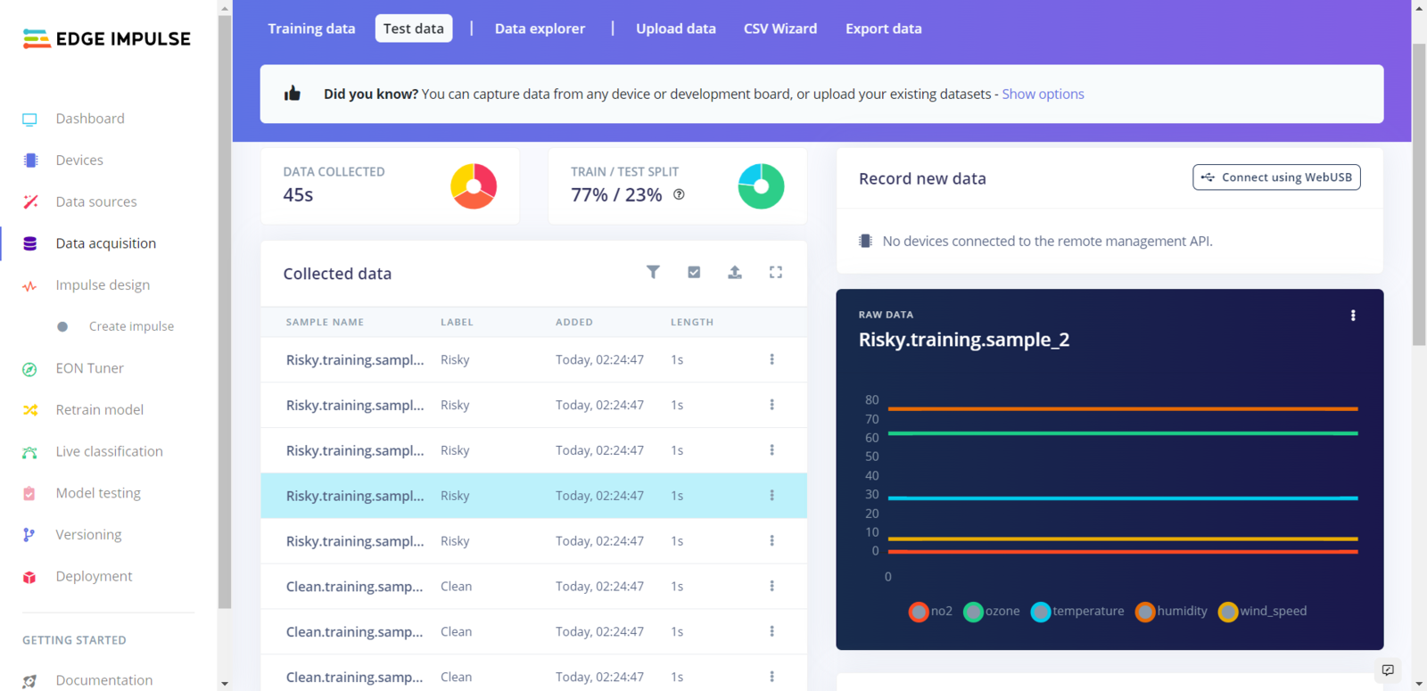 As long as the CSV file includes a header defining data fields, Edge Impulse can distinguish data records as individual samples in different data structures thanks to its CSV Wizard while adding existing data to an Edge Impulse project. Therefore, there is no need for preprocessing single CSV file data sets even if the data type is not time series. Since Edge Impulse can infer the uploaded sample’s label from its file name, I employed FireBeetle ESP32 to create a new CSV file for each data record and name the generated files by combining the given air pollution level and the sample number incremented by 1 for each class (label) automatically.- Clean.training.sample_1.csv