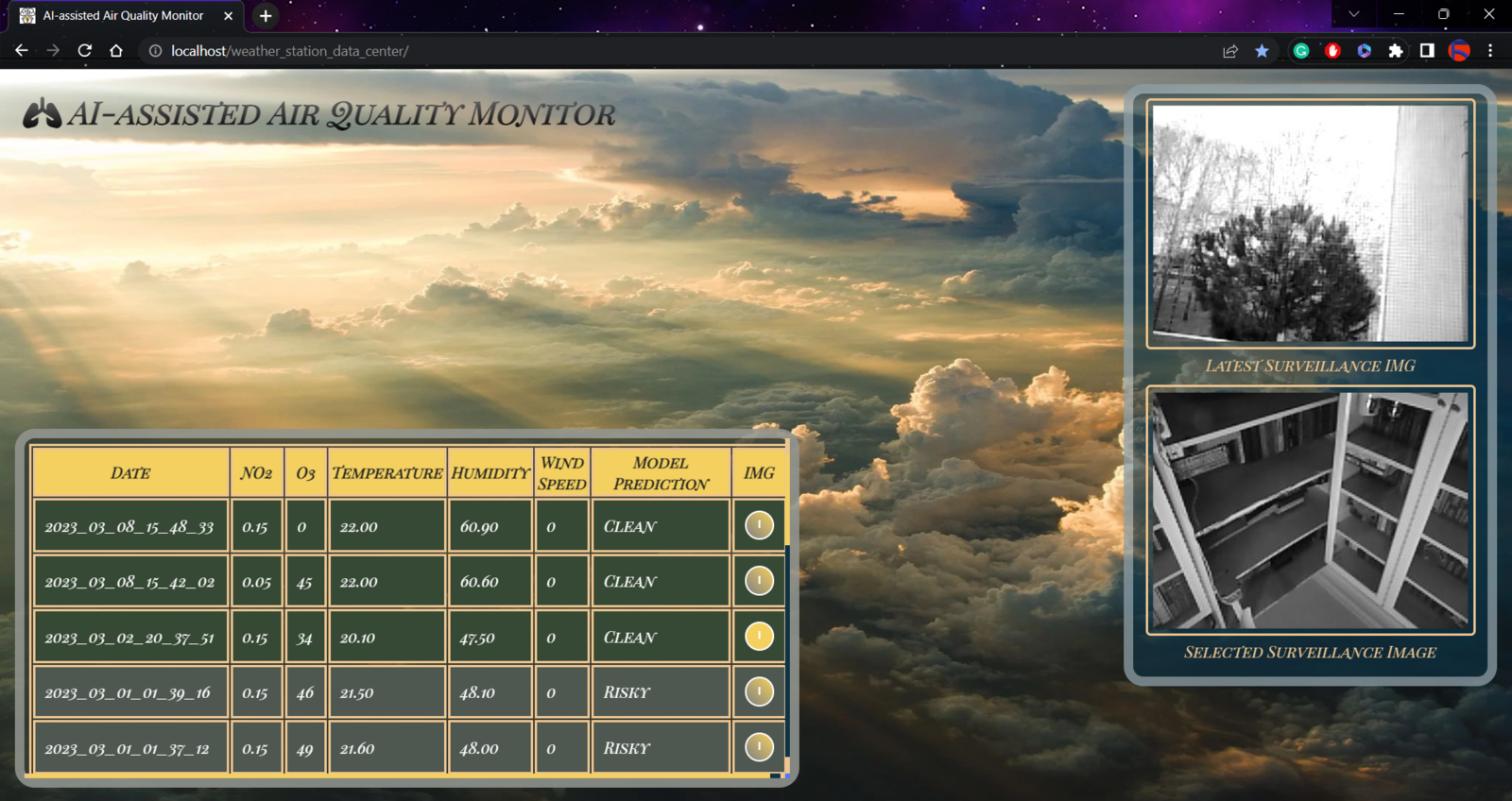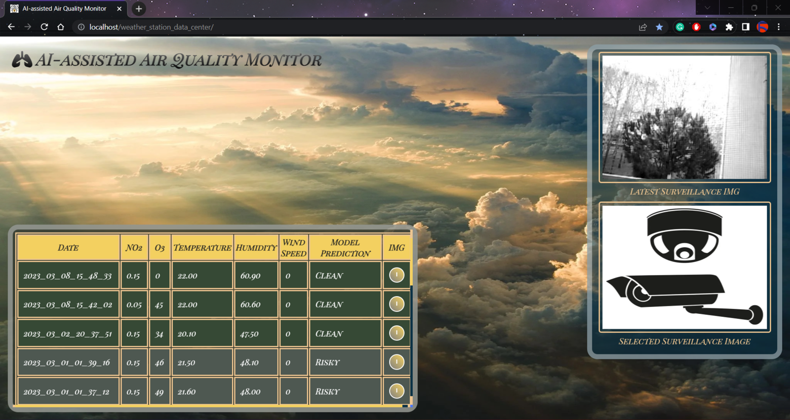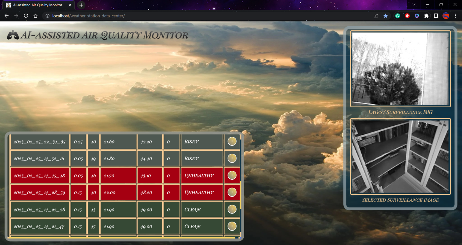 To provide an exceptional user experience for this AIoT air station, I developed a full-fledged web application from scratch in PHP, HTML, JavaScript, CSS, and MySQL. This web application obtains the collected air quality data, the detected air pollution level (class) by the neural network model, and the captured surveillance footage from FireBeetle ESP32 via an HTTP POST request. After saving the received information to the MySQL database table for further inspection, the web application converts the received raw image data to a JPG file via a Python script. Then, the web application updates itself automatically to show the latest received information and surveillance footage. Also, the application displays all stored air quality data with model detection results in descending order and allows the user to inspect previous surveillance footage. As shown below, the web application consists of three folders and seven code files:- /assets