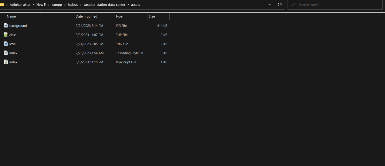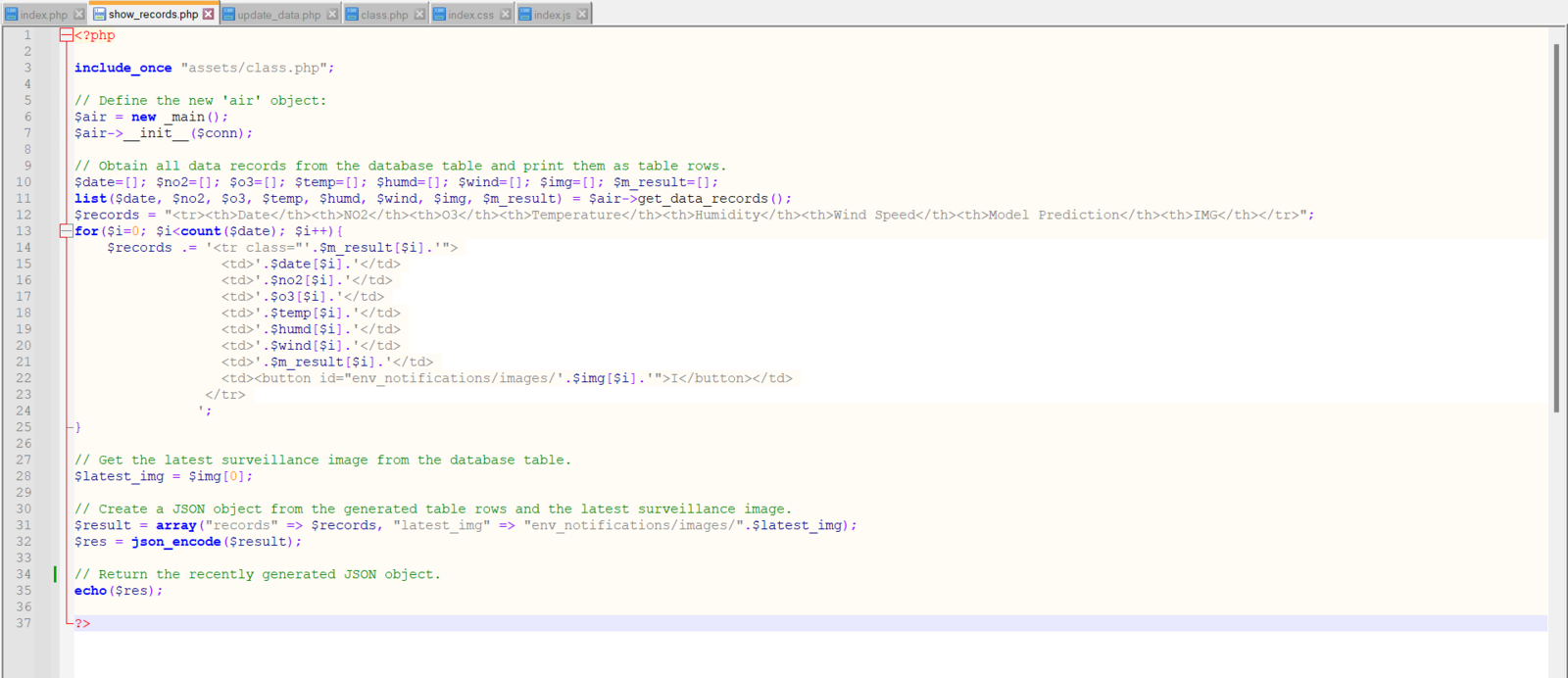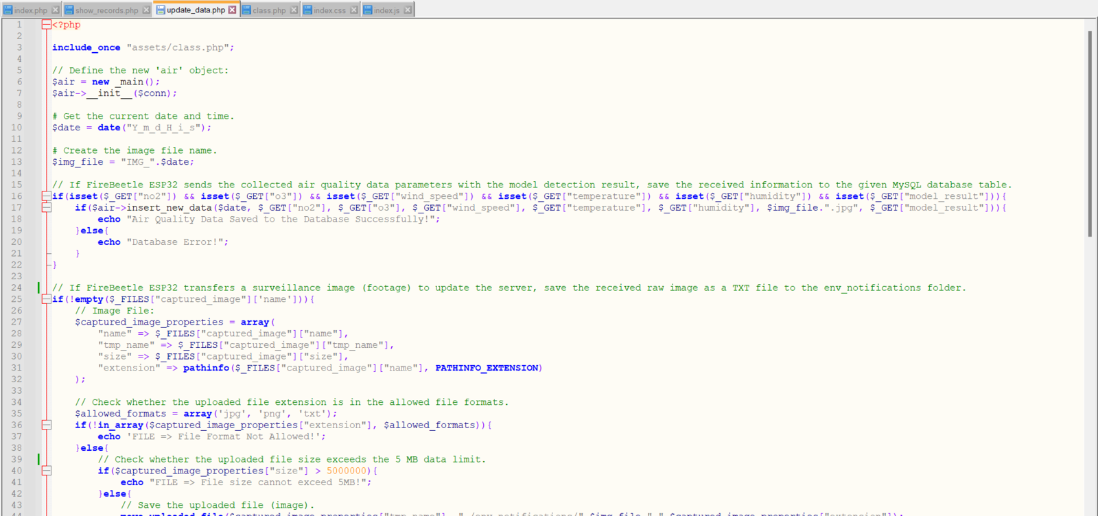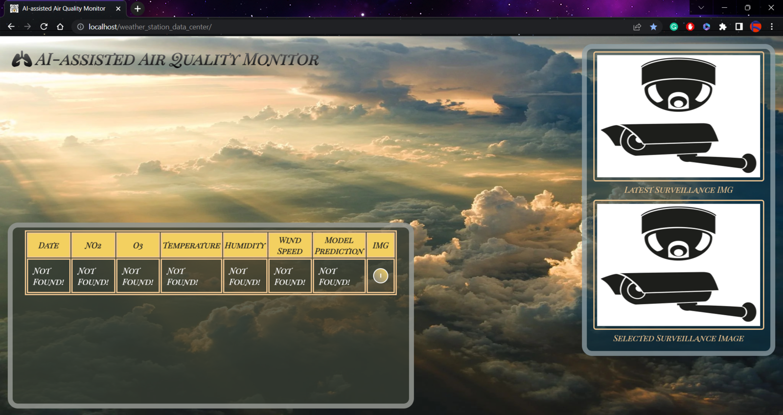 To provide an exceptional user experience for this AIoT air station, I developed a full-fledged web application from scratch in PHP, HTML, JavaScript, CSS, and MySQL. This web application obtains the collected air quality data, the detected air pollution level (class) by the neural network model, and the captured surveillance footage from FireBeetle ESP32 via an HTTP POST request. After saving the received information to the MySQL database table for further inspection, the web application converts the received raw image data to a JPG file via a Python script. Then, the web application updates itself automatically to show the latest received information and surveillance footage. Also, the application displays all stored air quality data with model detection results in descending order and allows the user to inspect previous surveillance footage. As shown below, the web application consists of three folders and seven code files:- /assets