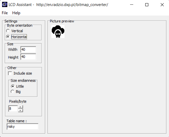 To display images (black and white) on the SH1106 OLED screen successfully, I needed to create monochromatic bitmaps from PNG or JPG files and convert those bitmaps to data arrays. :hash: First of all, download the LCD Assistant. :hash: Then, upload a monochromatic bitmap and select Vertical or Horizontal depending on the screen type. :hash: Convert the image (bitmap) and save the output (data array). :hash: Finally, add the data array to the code and print it on the screen.