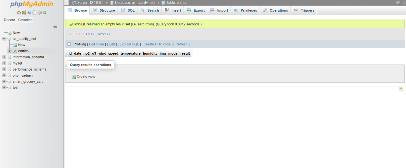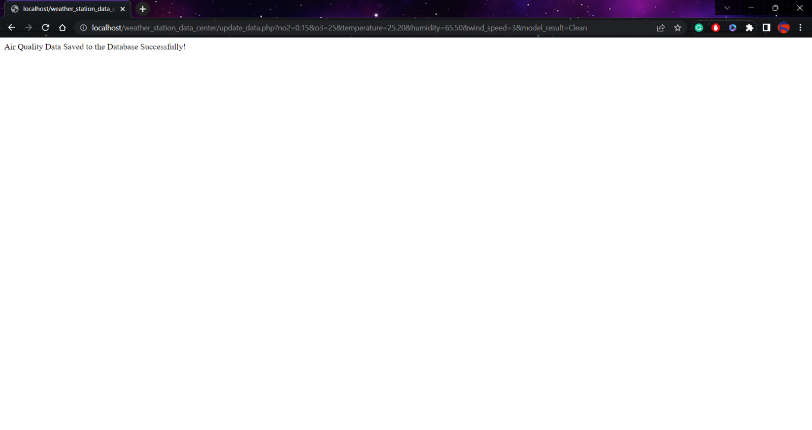 After setting the web application on LattePanda 3 Delta 864: 🎈⚠️📲 The web application (update_data.php) saves the information transferred by FireBeetle ESP32 via an HTTP POST request with URL query parameters to the given MySQL database table. /update_data.php?no2=0.15&o3=25&temperature=25.20&humidity=65.50&wind_speed=3&model_result=Clean