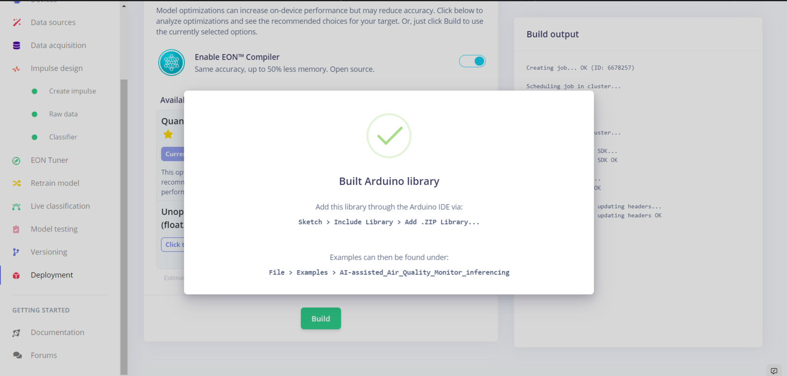 After building, training, and deploying my model as an Arduino library on Edge Impulse, I needed to upload the generated Arduino library on FireBeetle ESP32 to run the model directly so as to create an easy-to-use and capable air station operating with minimal latency, memory usage, and power consumption. Since Edge Impulse optimizes and formats signal processing, configuration, and learning blocks into a single package while deploying models as Arduino libraries, I was able to import my model effortlessly to run inferences. :hash: After downloading the model as an Arduino library in the ZIP file format, go to Sketch ➡ Include Library ➡ Add .ZIP Library… :hash: Then, include the AI-assisted_Air_Quality_Monitor_inferencing.h file to import the Edge Impulse neural network model.- User Button (Built-in) ➡ Run Inference